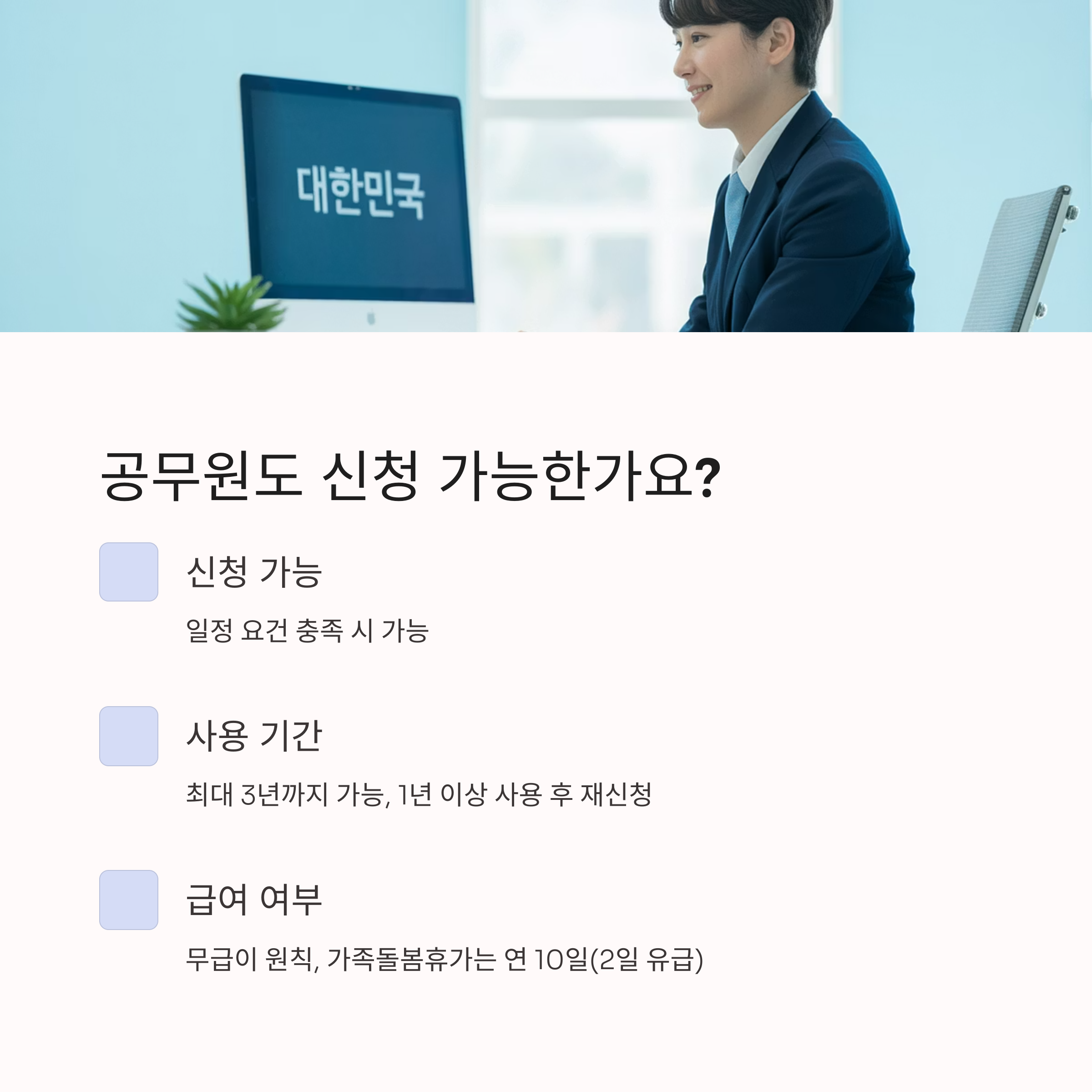 공무원도 일정 요건을 충족할 경우 가족돌봄휴직을 사용할 수 있습니다.