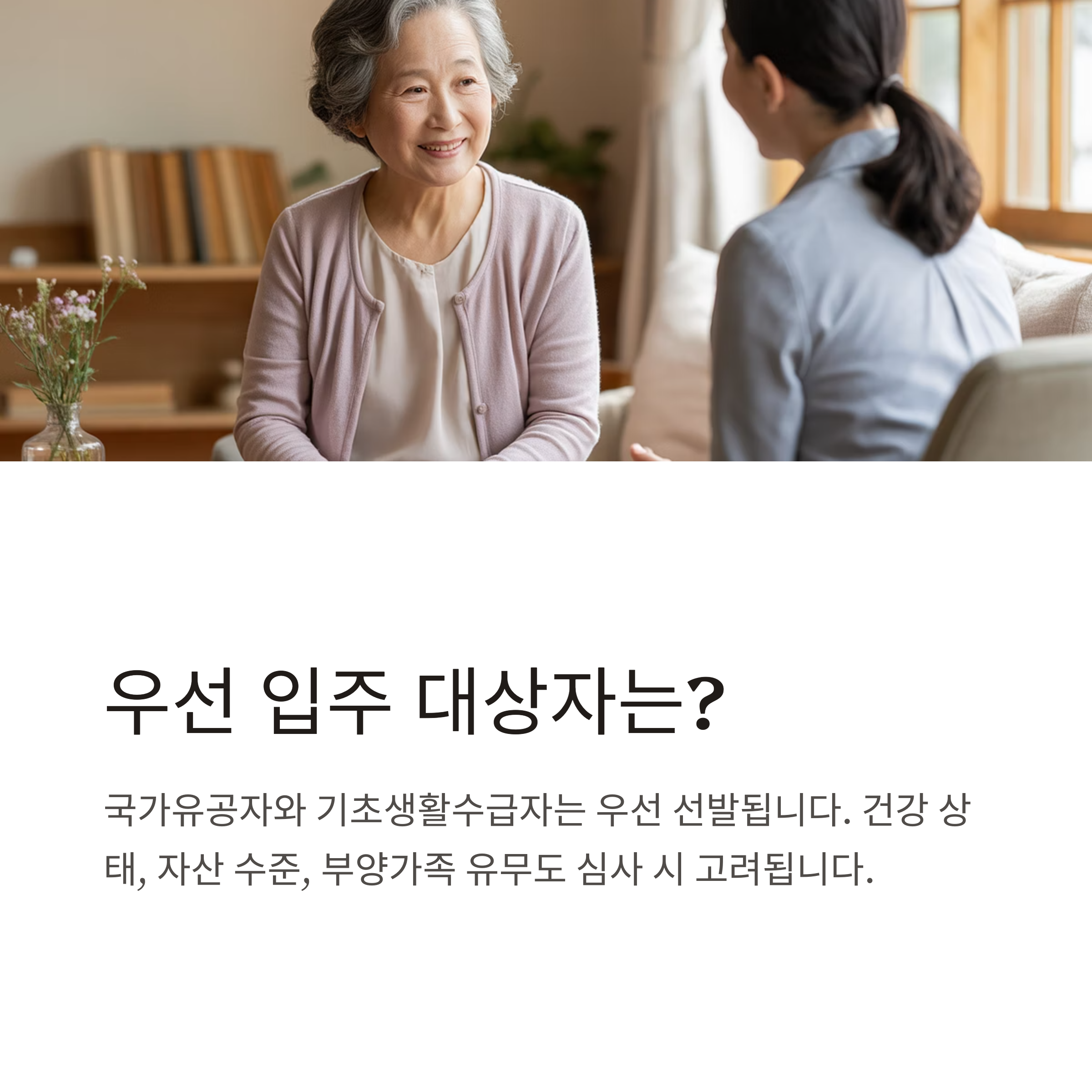 건강 상태, 자산 수준, 부양가족 유무도 입주 심사 시 참고됩니다. 지자체별로 입주자격이 다소 다를 수 있으니 모집공고 확인은 필수입니다.