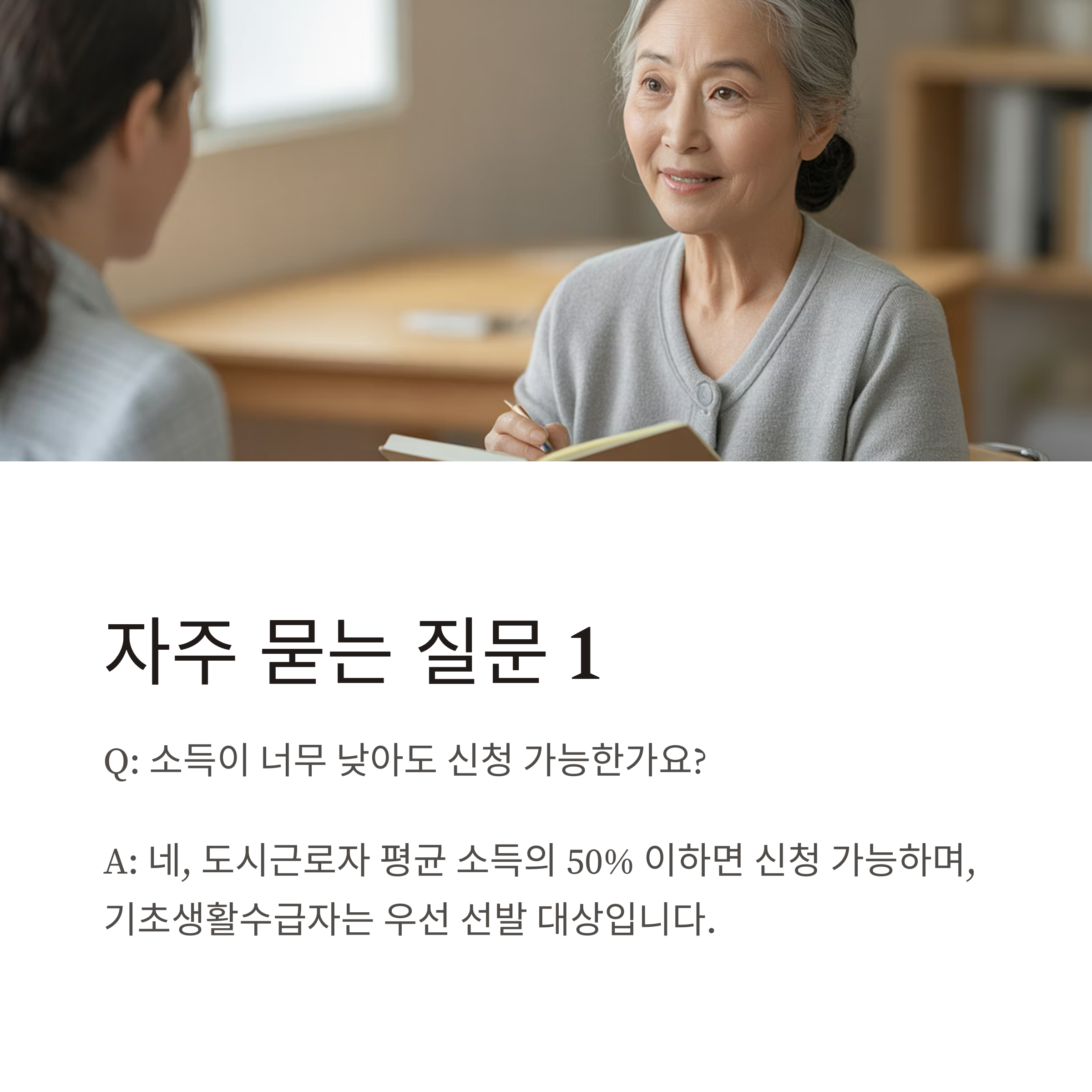 A1. 가능합니다. 도시근로자 평균 소득의 50% 이하이면 신청 가능하며