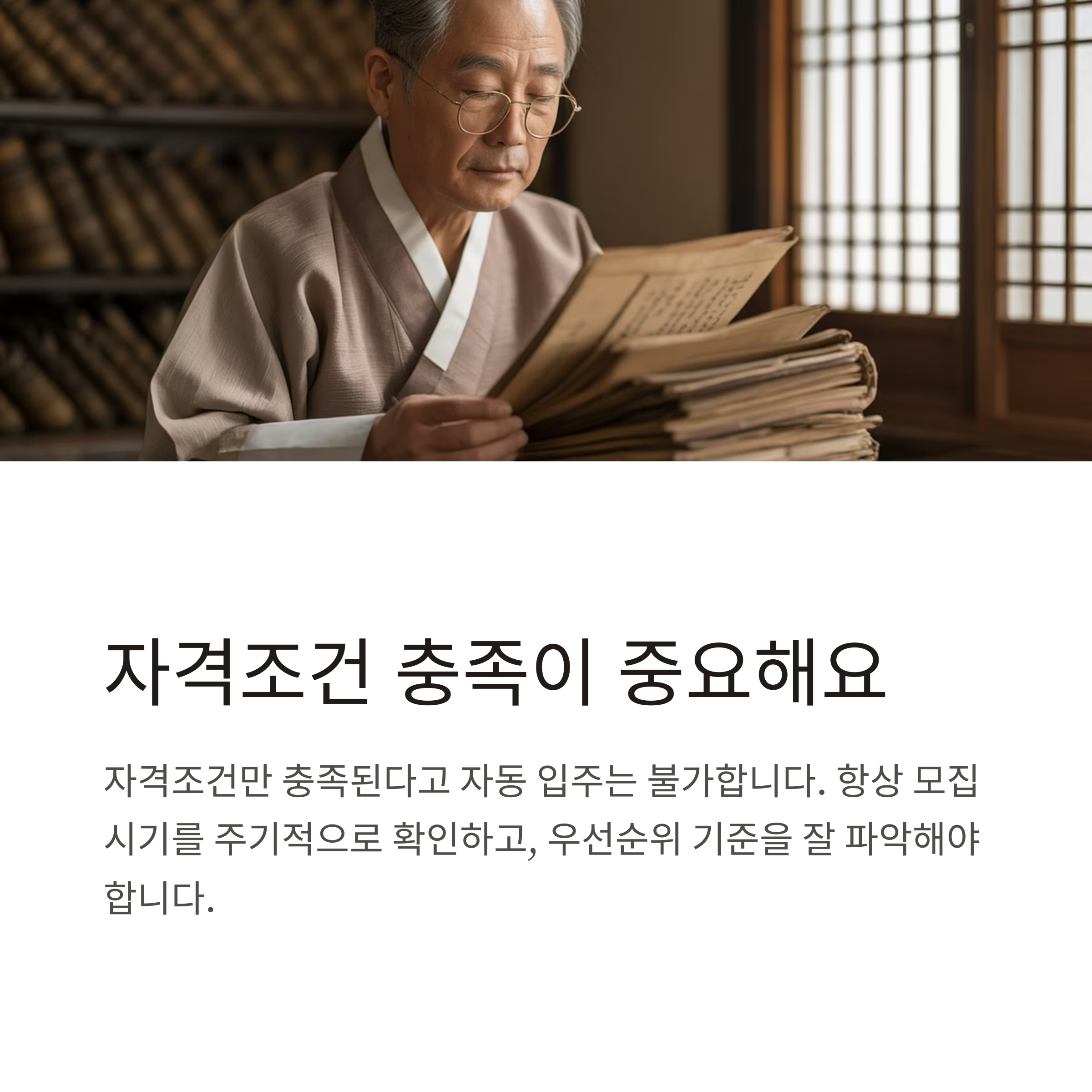 자격조건만 충족된다고 자동 입주는 불가하며, 항상 모집 시기를 주기적으로 확인해야 합니다.