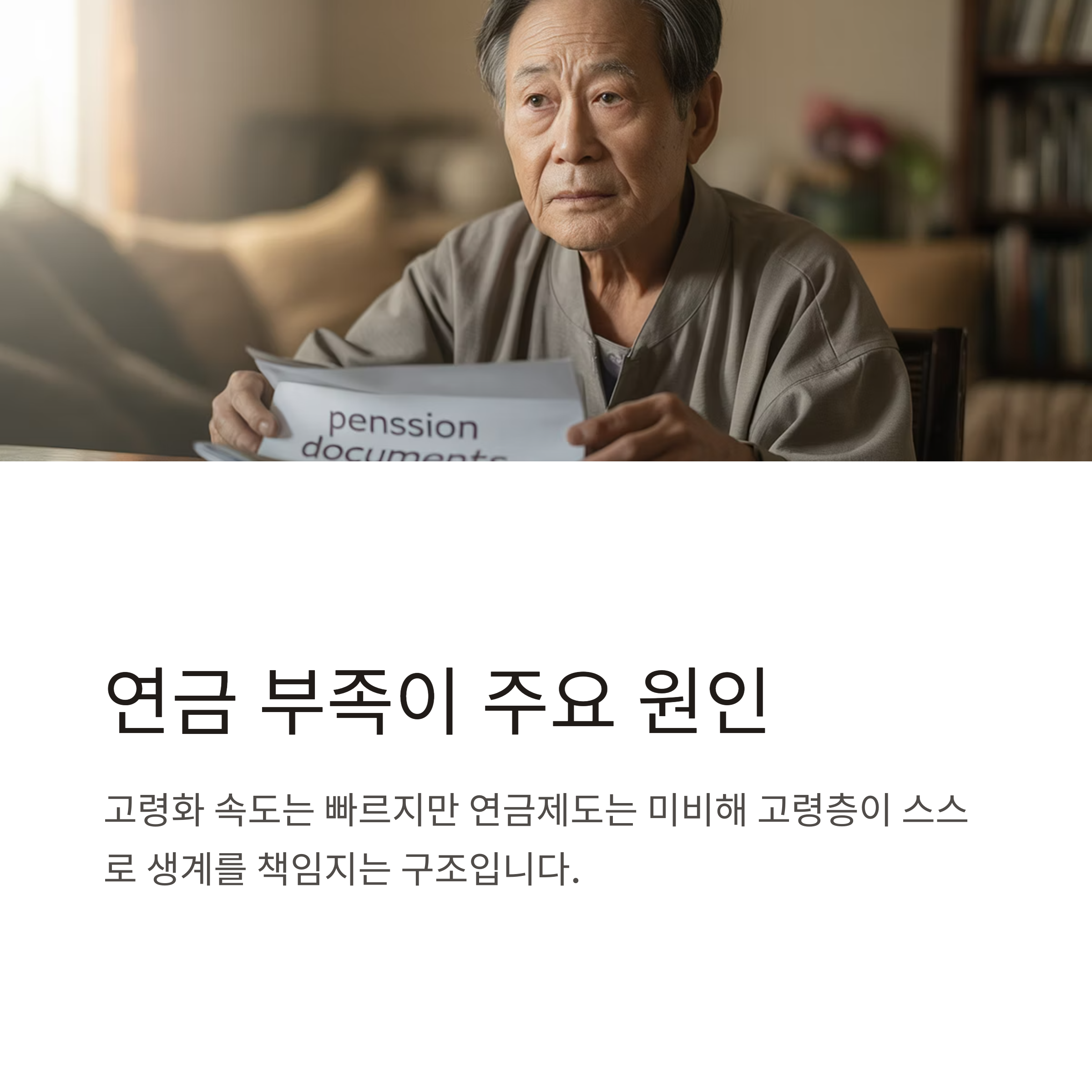 고령화 속도는 빠르지만 연금제도는 미비, 결국 고령층은 스스로 생계를 책임지는 구조입니다.