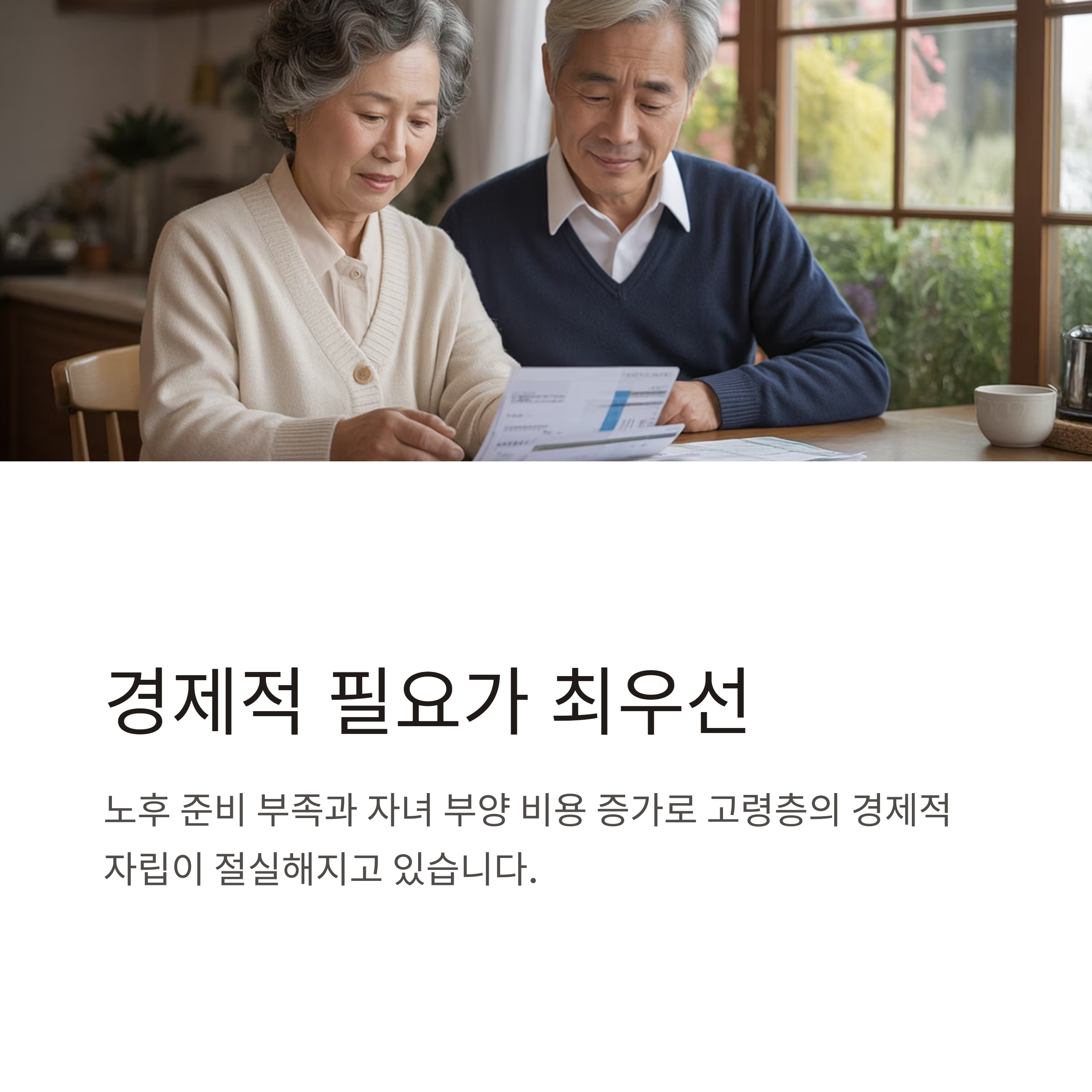 고령층이 계속 일하는 가장 큰 이유는 단연 '경제적 필요'입니다.