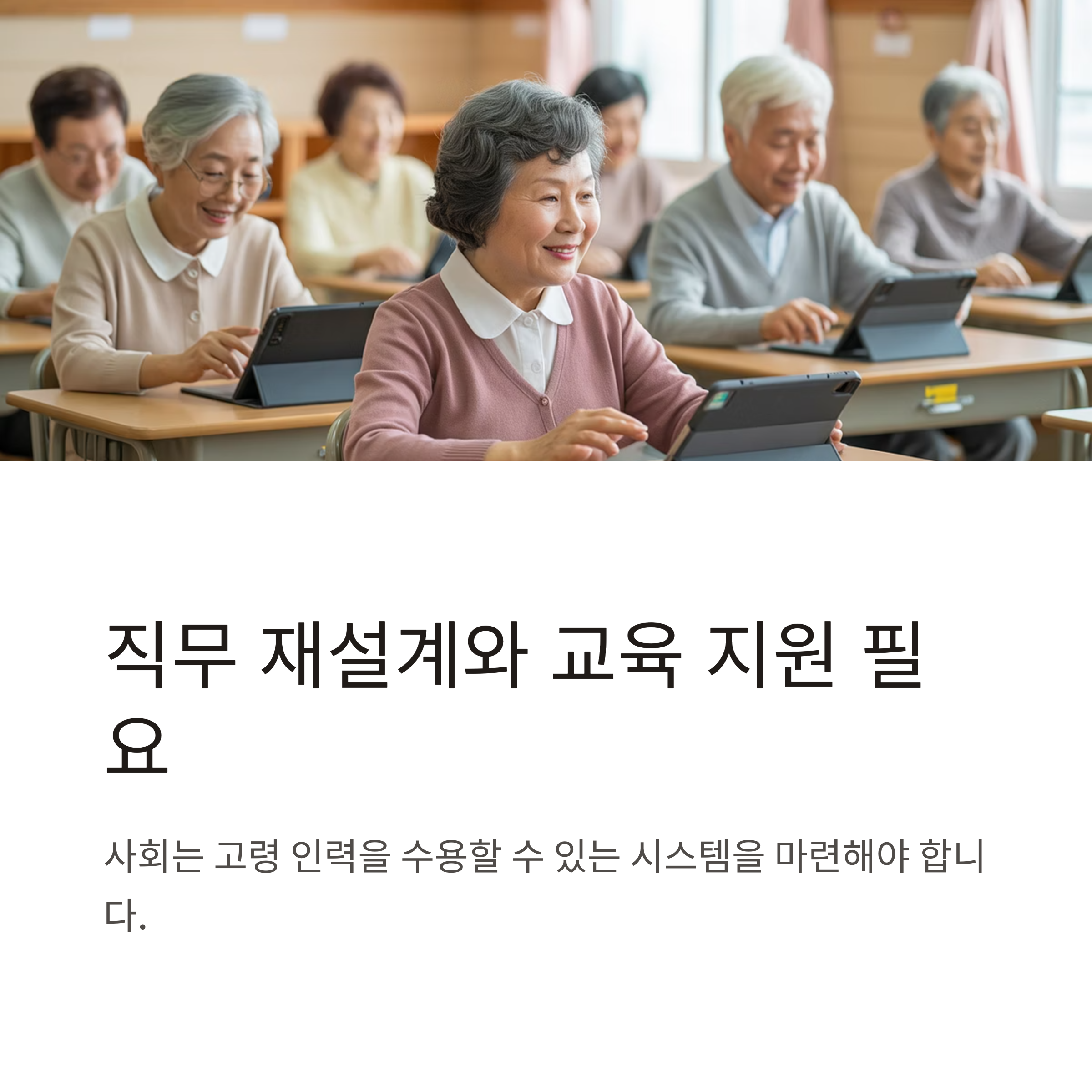 사회는 더 많은 고령 인력을 수용할 수 있는 직무 재설계와 교육 지원 시스템을 마련해야 합니다.