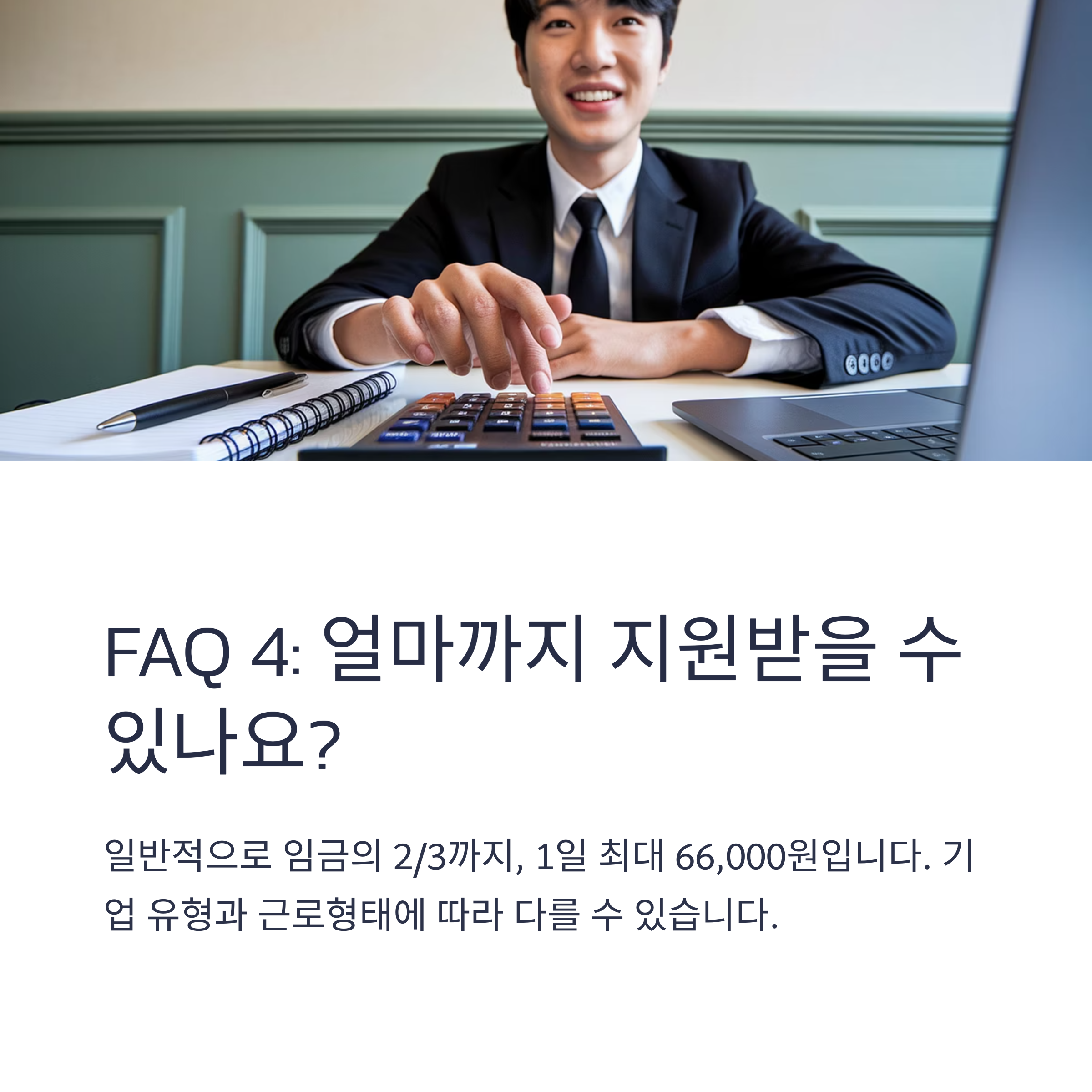 A4. 일반적으로 임금의 2/3까지, 1일 최대 66,000원입니다. 기업의 유형과 근로형태에 따라 다를 수 있습니다.