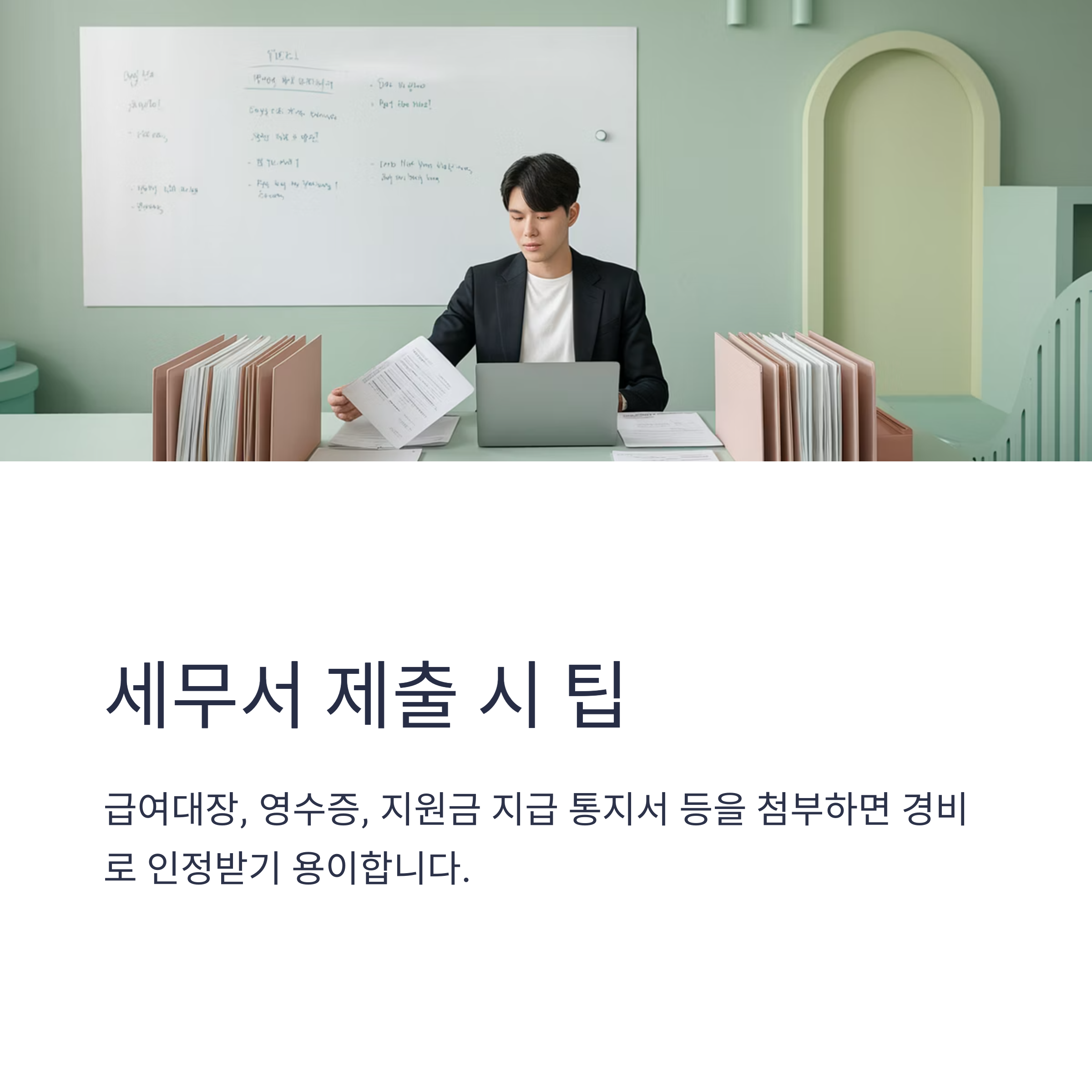 ▶ 세무서 제출 시 급여대장, 영수증, 지원금 지급 통지서 등을 첨부하면 경비로 인정받기 용이합니다.