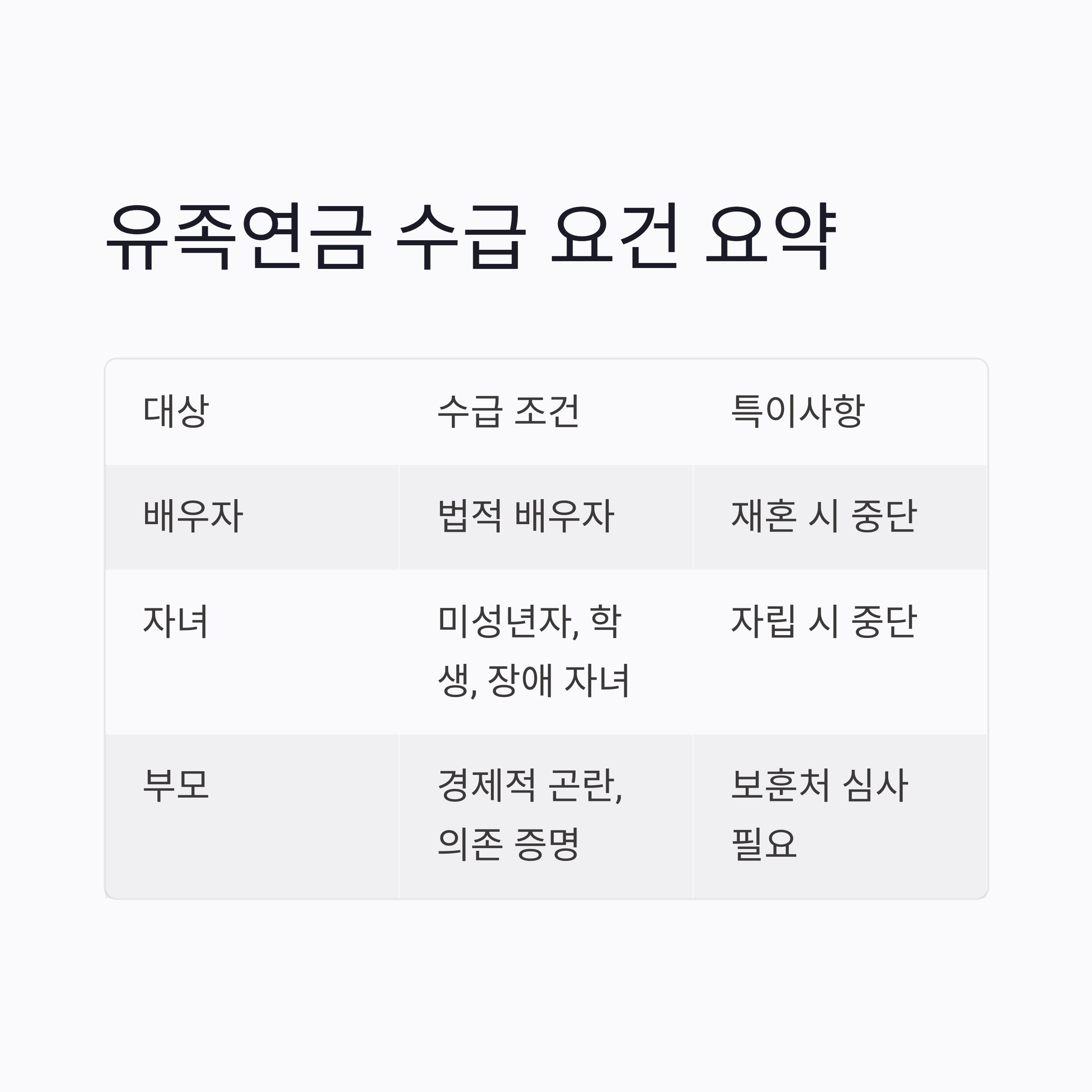 - 법적 혼인 상태여야 하며, 사망 당시 등록된 배우자에 한함