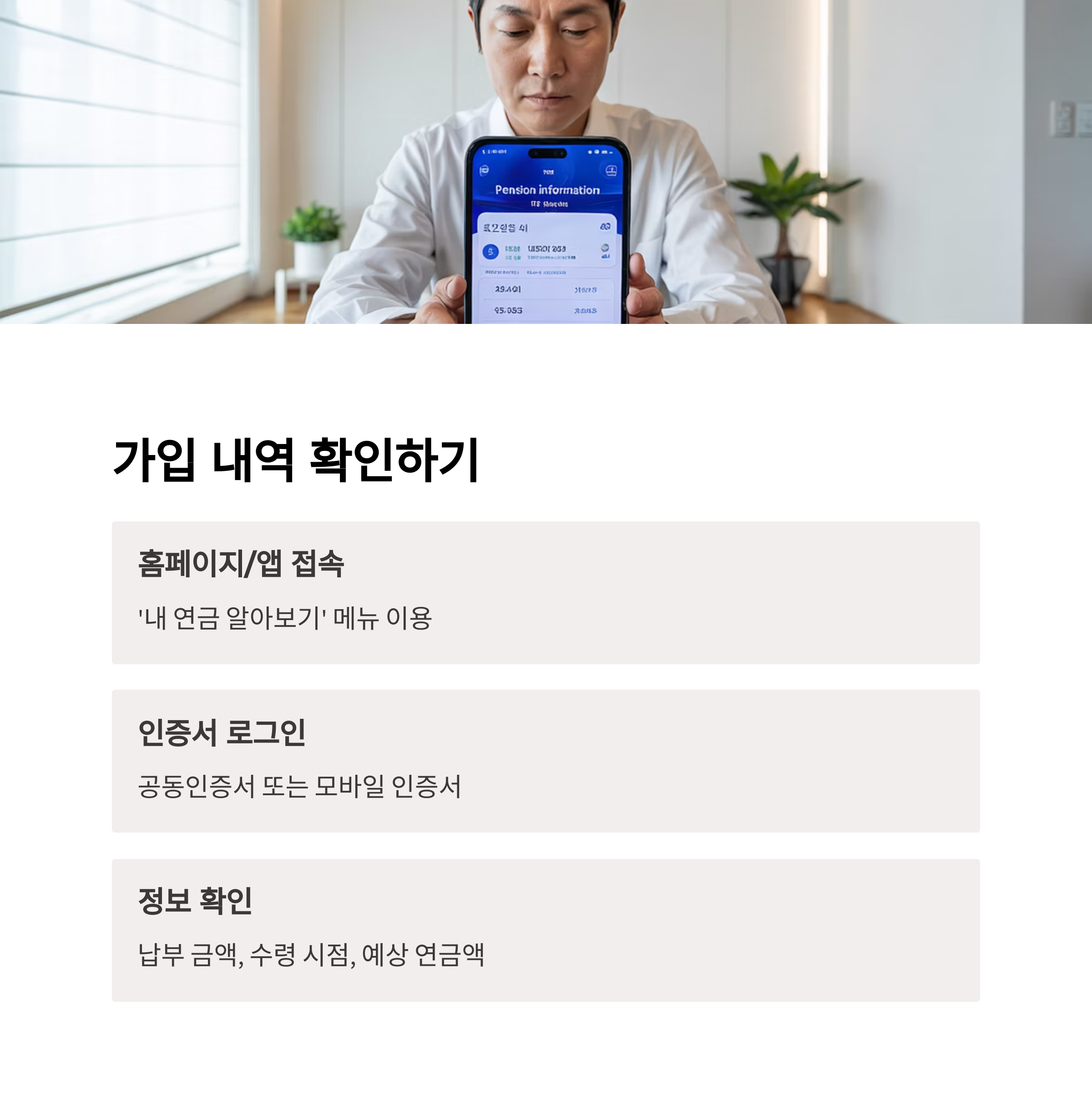 국민연금공단 홈페이지 또는 모바일 앱에서 ‘내 연금 알아보기’ 메뉴를 통해 공동인증서 또는 모바일 인증서 로그인만으로 간편하게 확인할 수 있습니다.