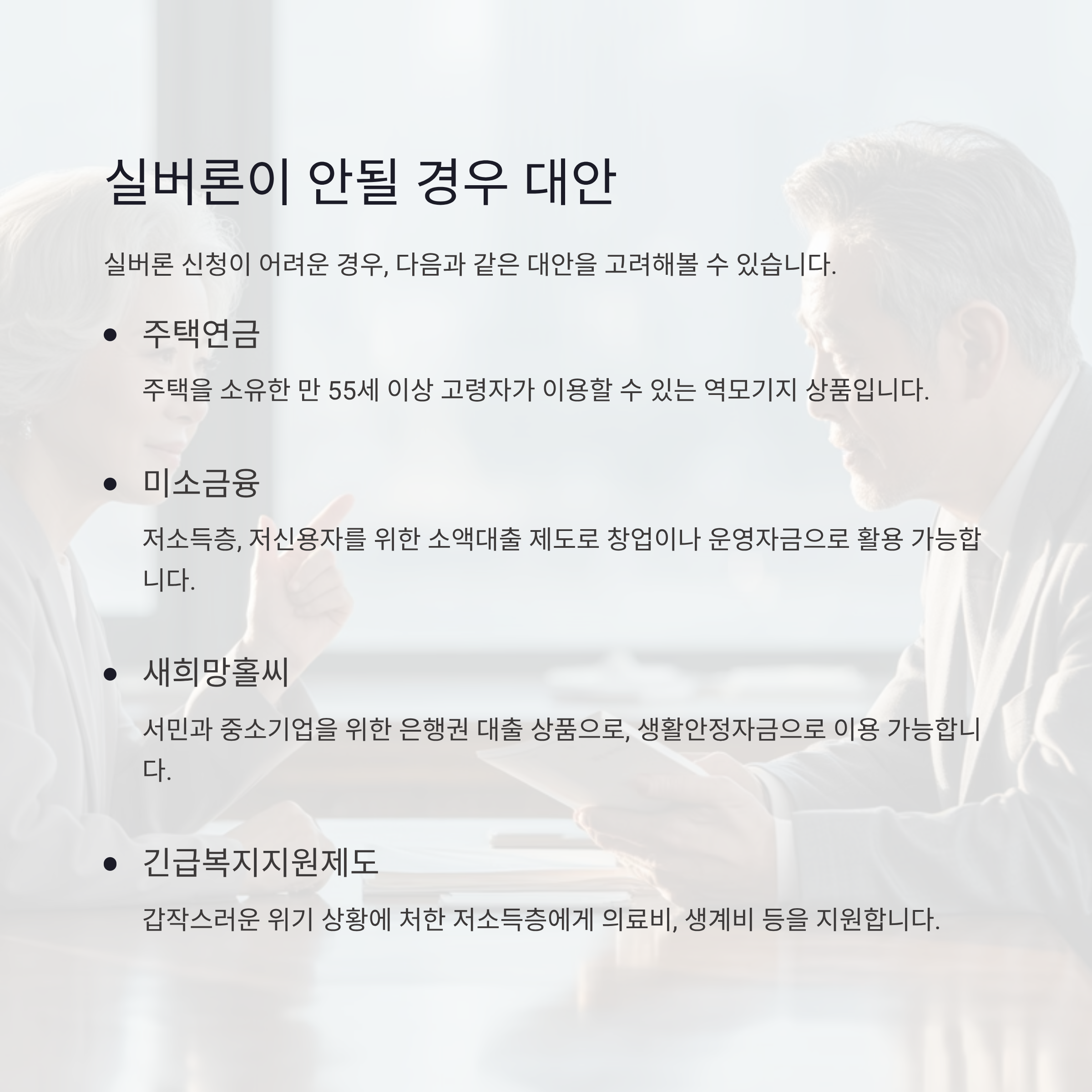 📌 자격이 되지 않는 경우, 다른 고령자 정책 대출도 함께 검토해보는 것이 좋습니다.