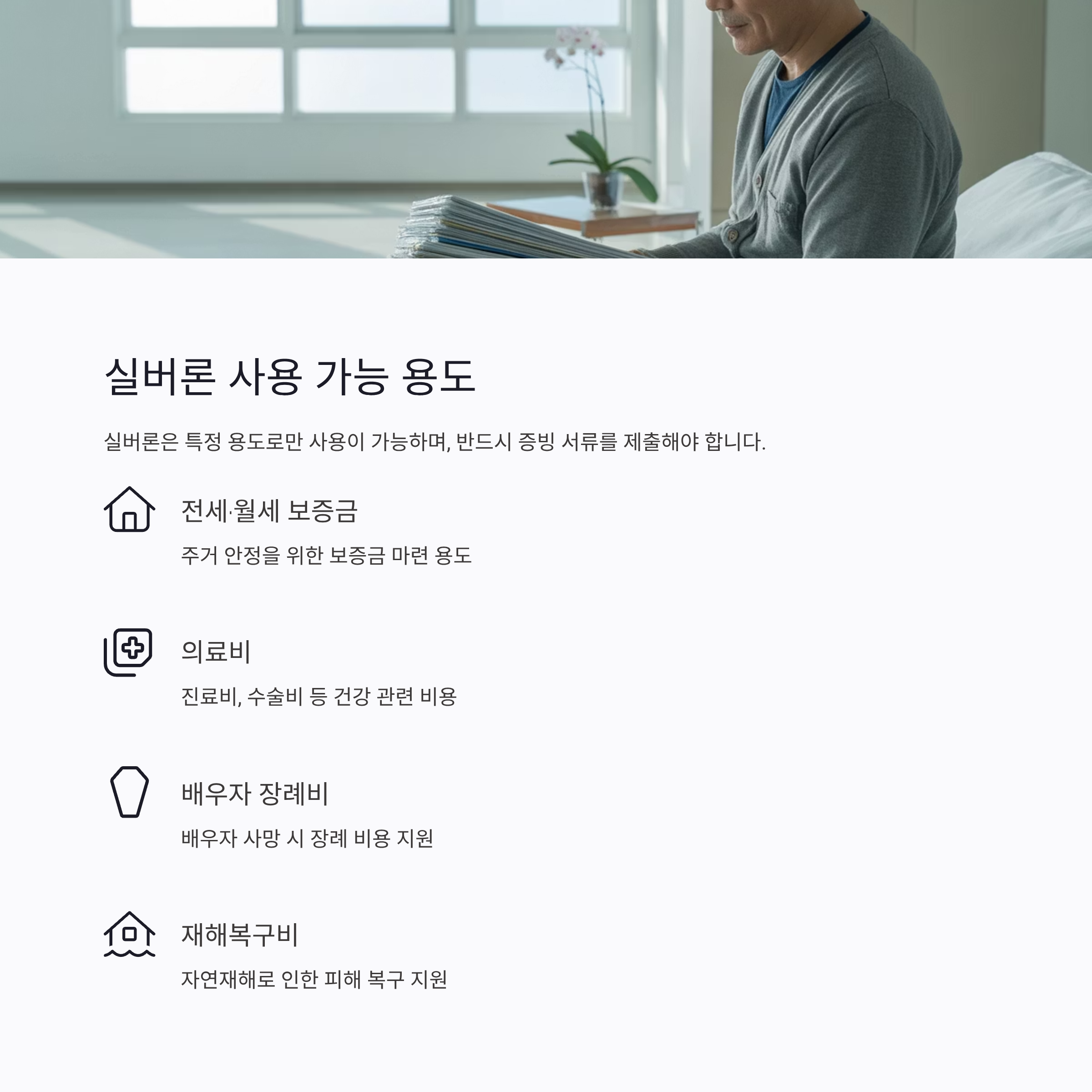 실버론은 일반 생활비나 소비성 목적으로는 사용할 수 없습니다. 아래 4가지에만 사용 가능하며