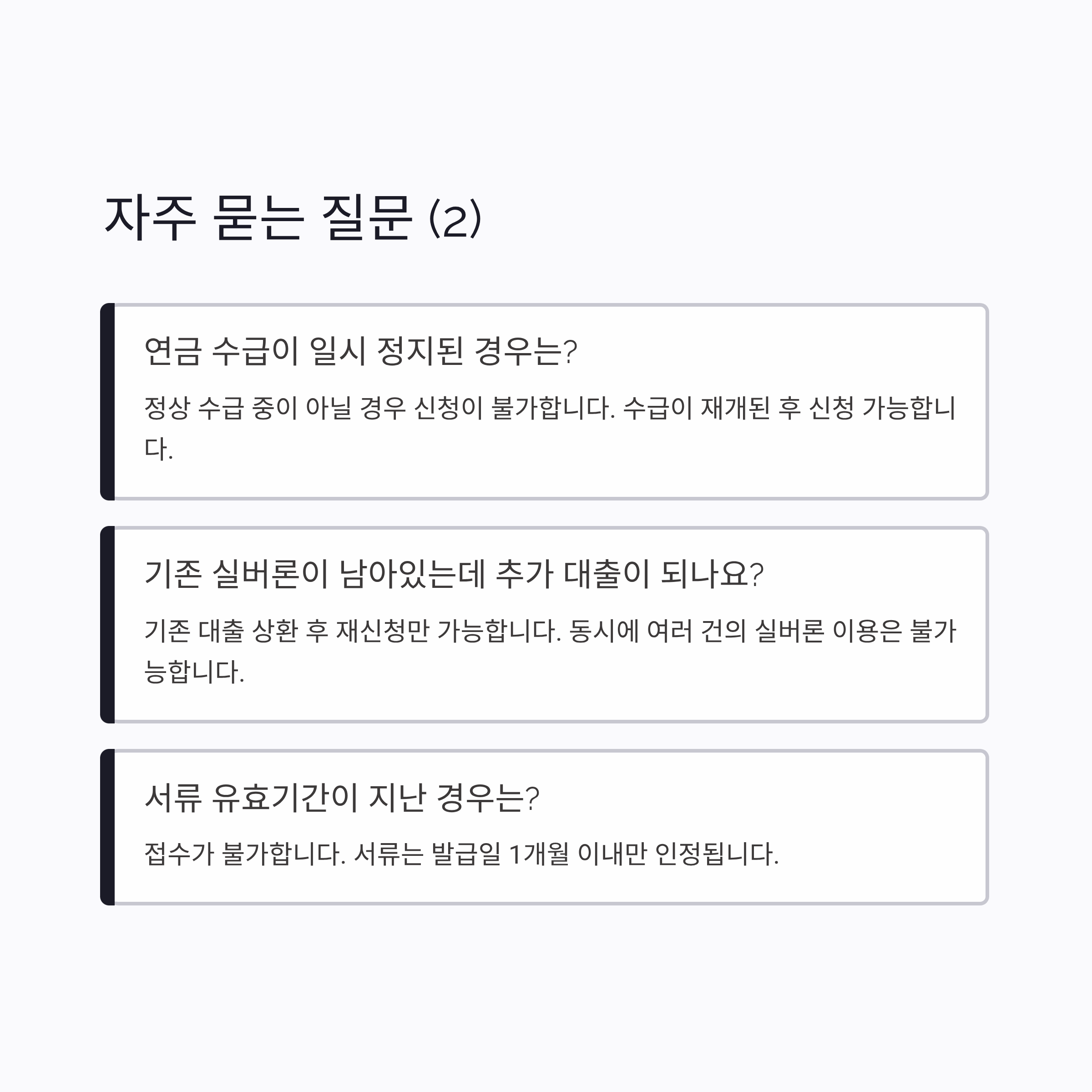 | 대출한도 | 연금 수령액의 2배 이내, 최대 1,000만원 |