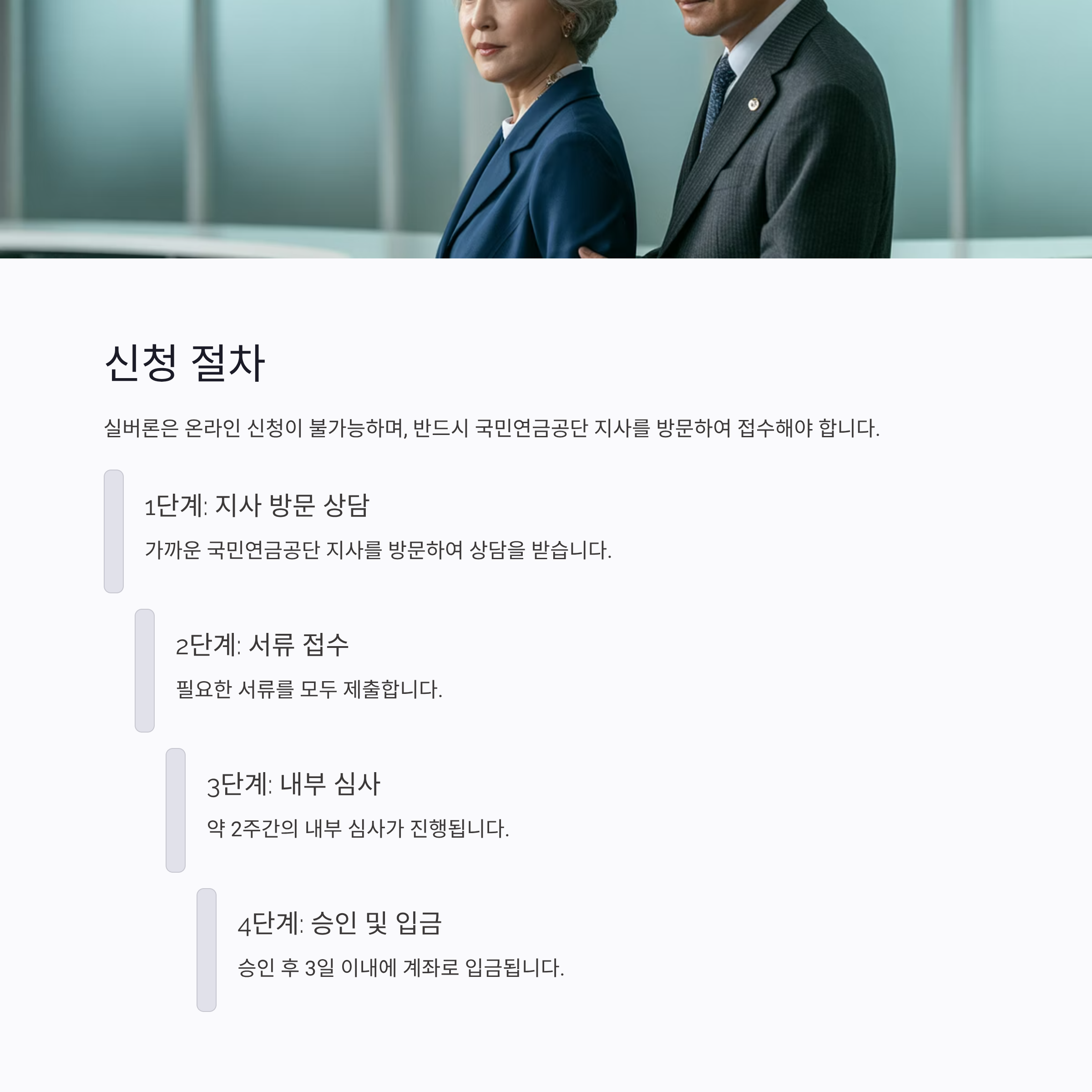 실버론은 온라인 신청이 불가능하며, 반드시 국민연금공단 지사 방문 접수만 가능합니다.