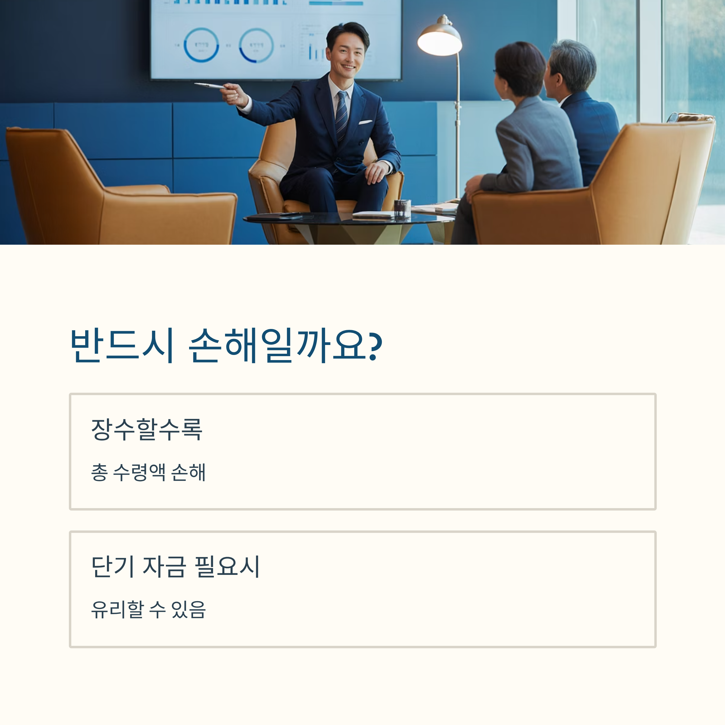 A7. 상황에 따라 다릅니다. 장수할수록 손해이지만, 단기 자금 확보가 급한 경우에는 유리할 수 있습니다.
