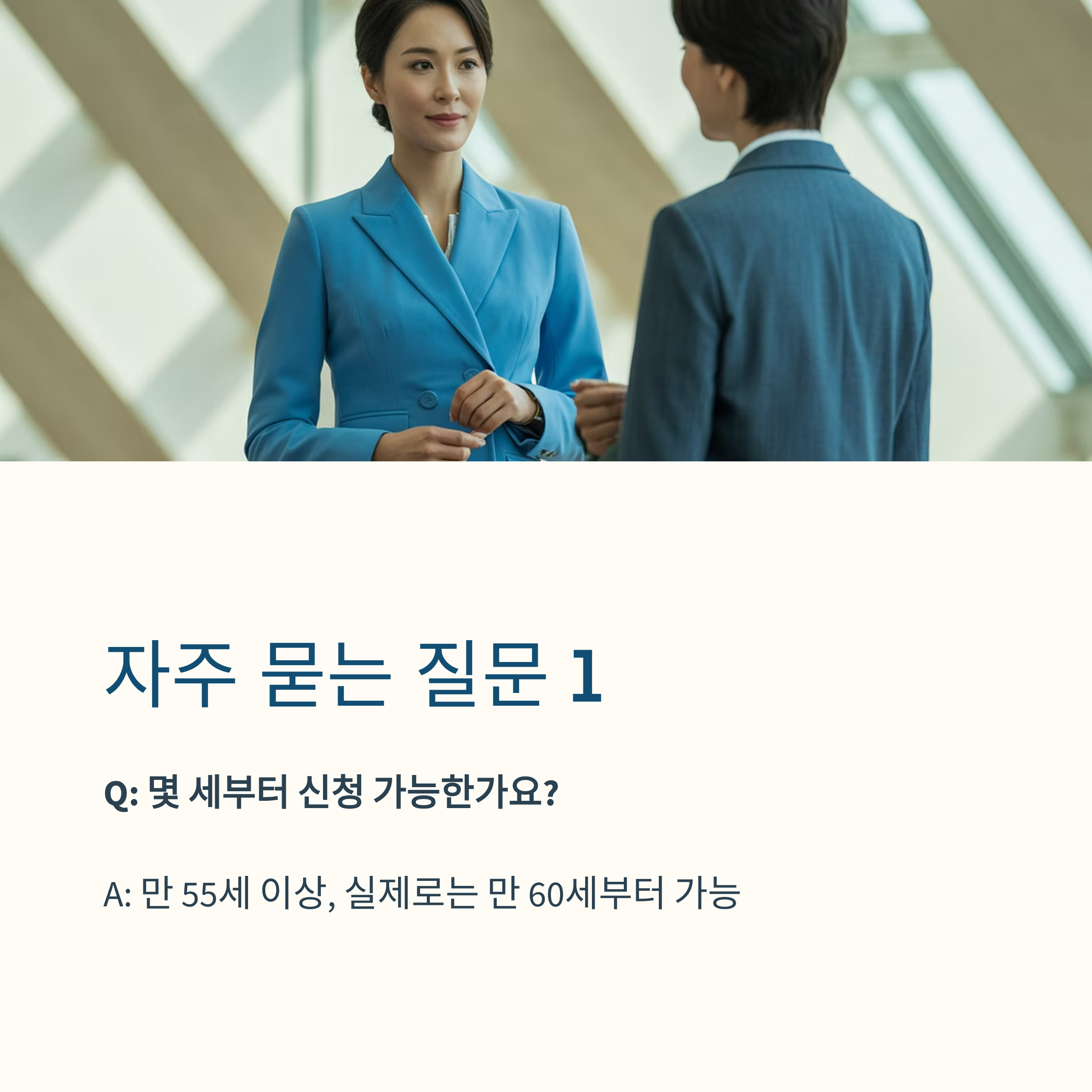 A1. 만 55세 이상이면서 정규 수령 5년 전인 만 60세부터 신청 가능합니다.