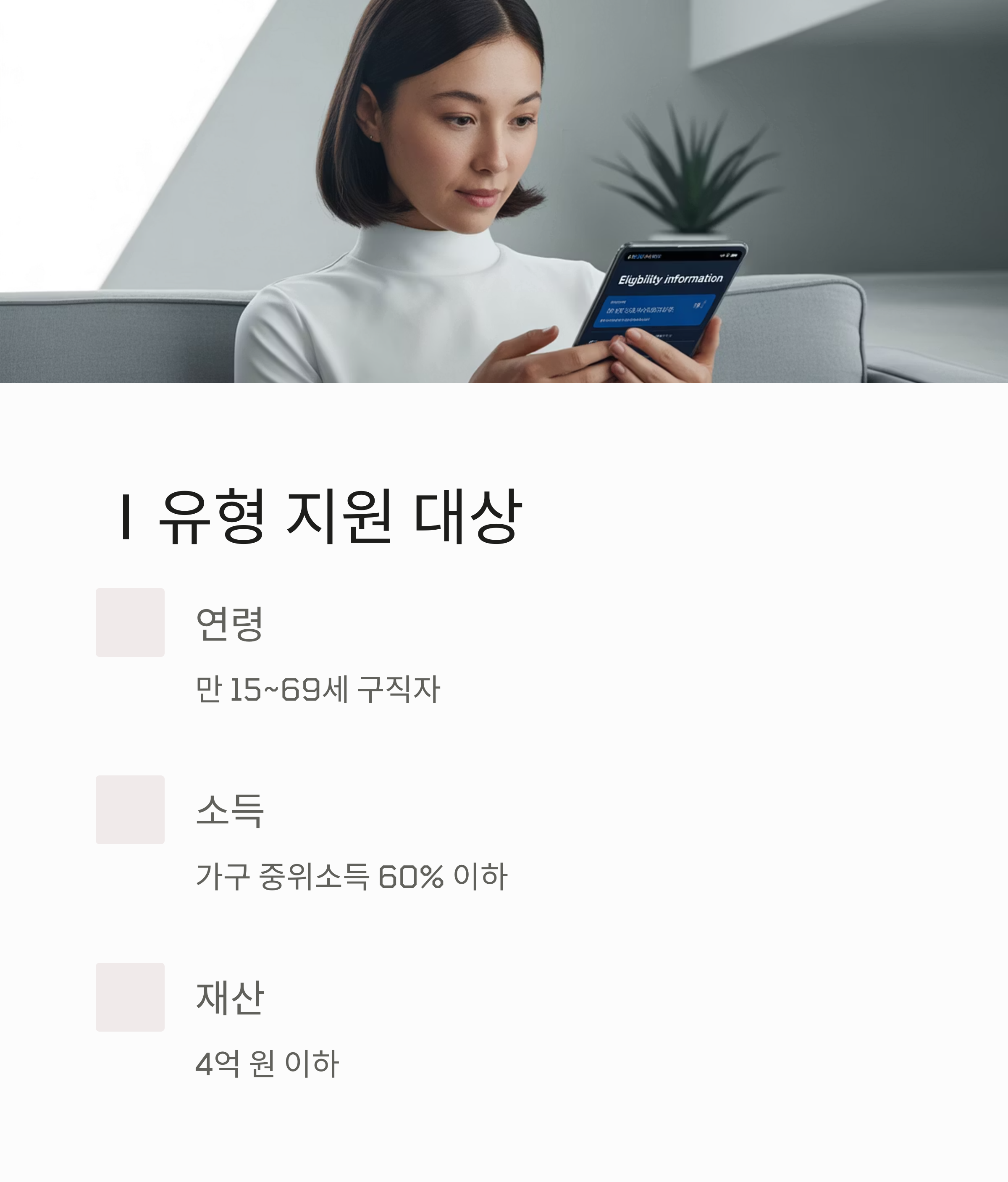 지원 대상은 아래와 같이 Ⅰ유형과 Ⅱ유형으로 나뉘어 소득과 재산 요건에 따라 달라집니다.