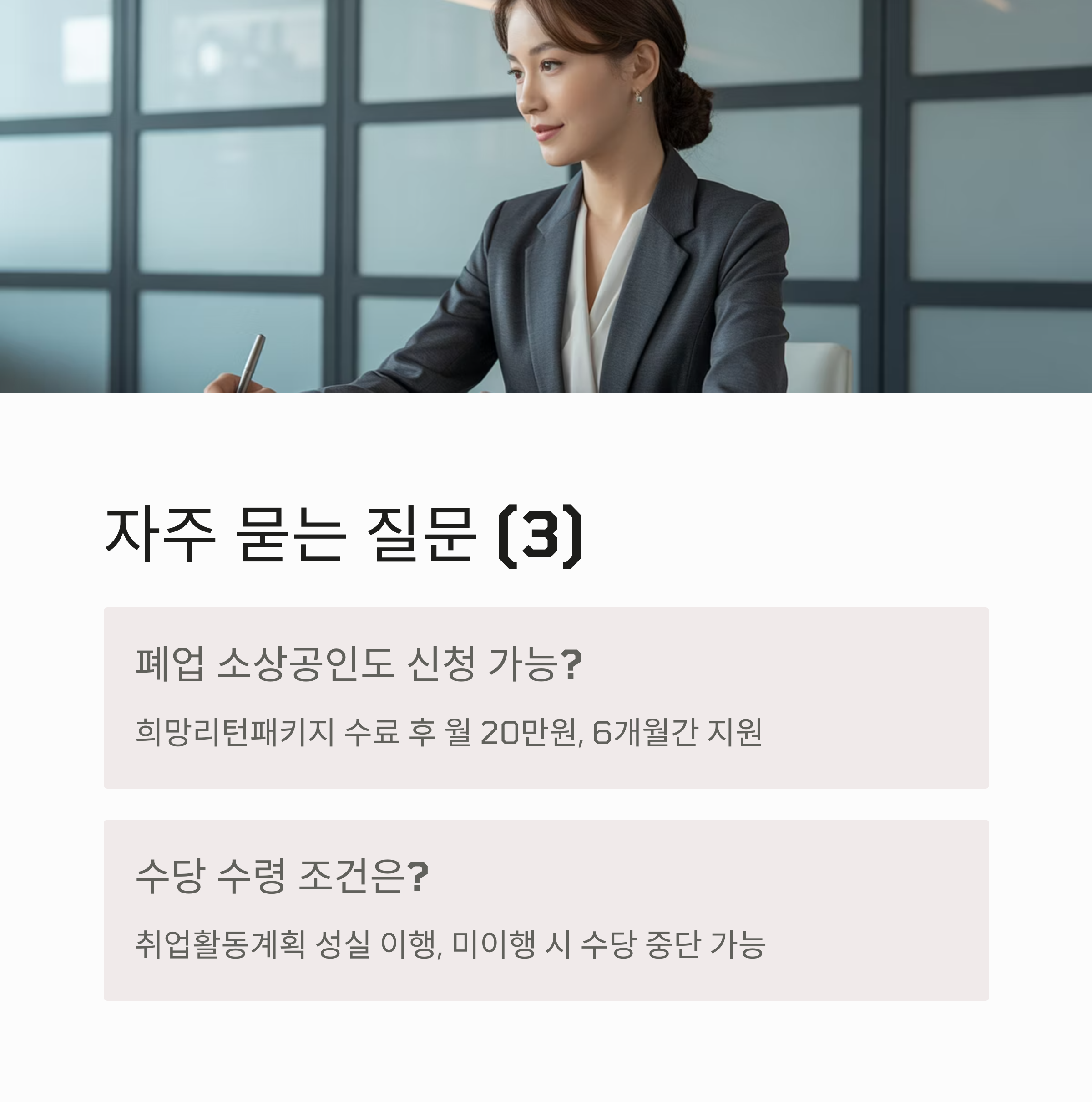 A5. ‘희망리턴패키지 기초교육’을 수료한 경우, 최대 6개월 간 월 20만 원의 수당을 받을 수 있습니다.