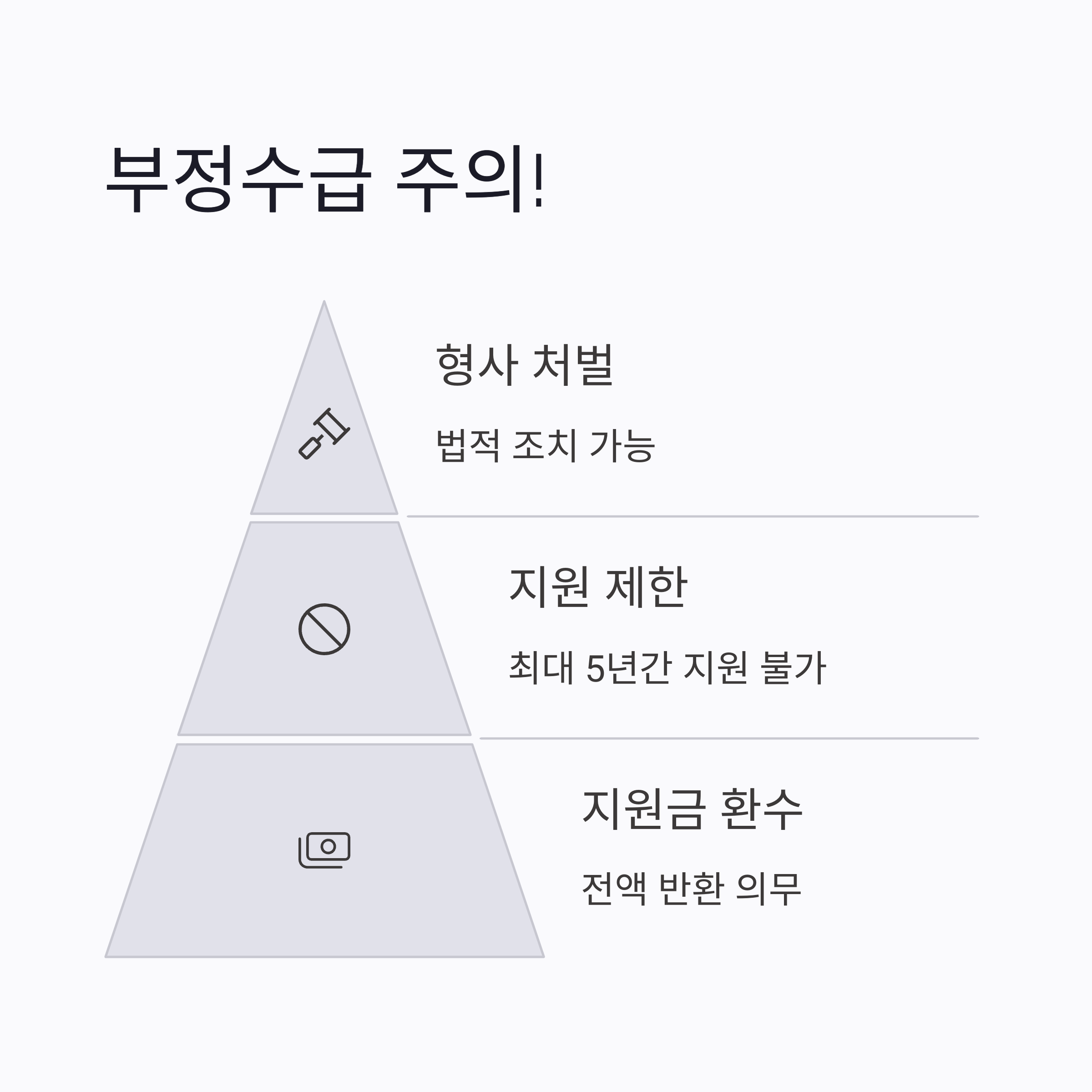 부정수급은 의도했든 아니든 지원금 전액 환수 및 형사 처벌 대상이 될 수 있습니다.
