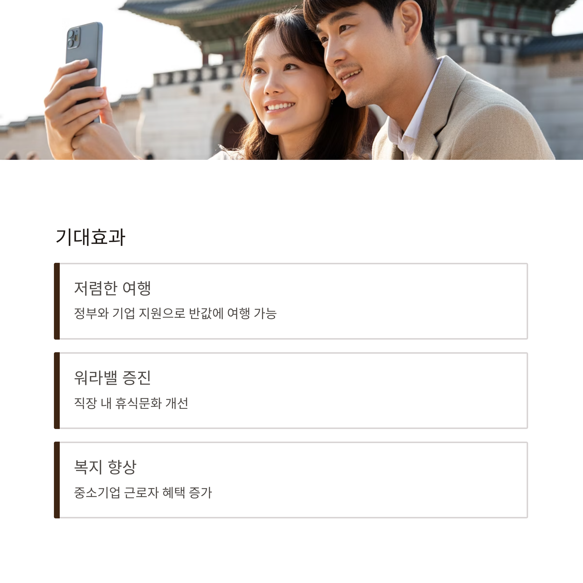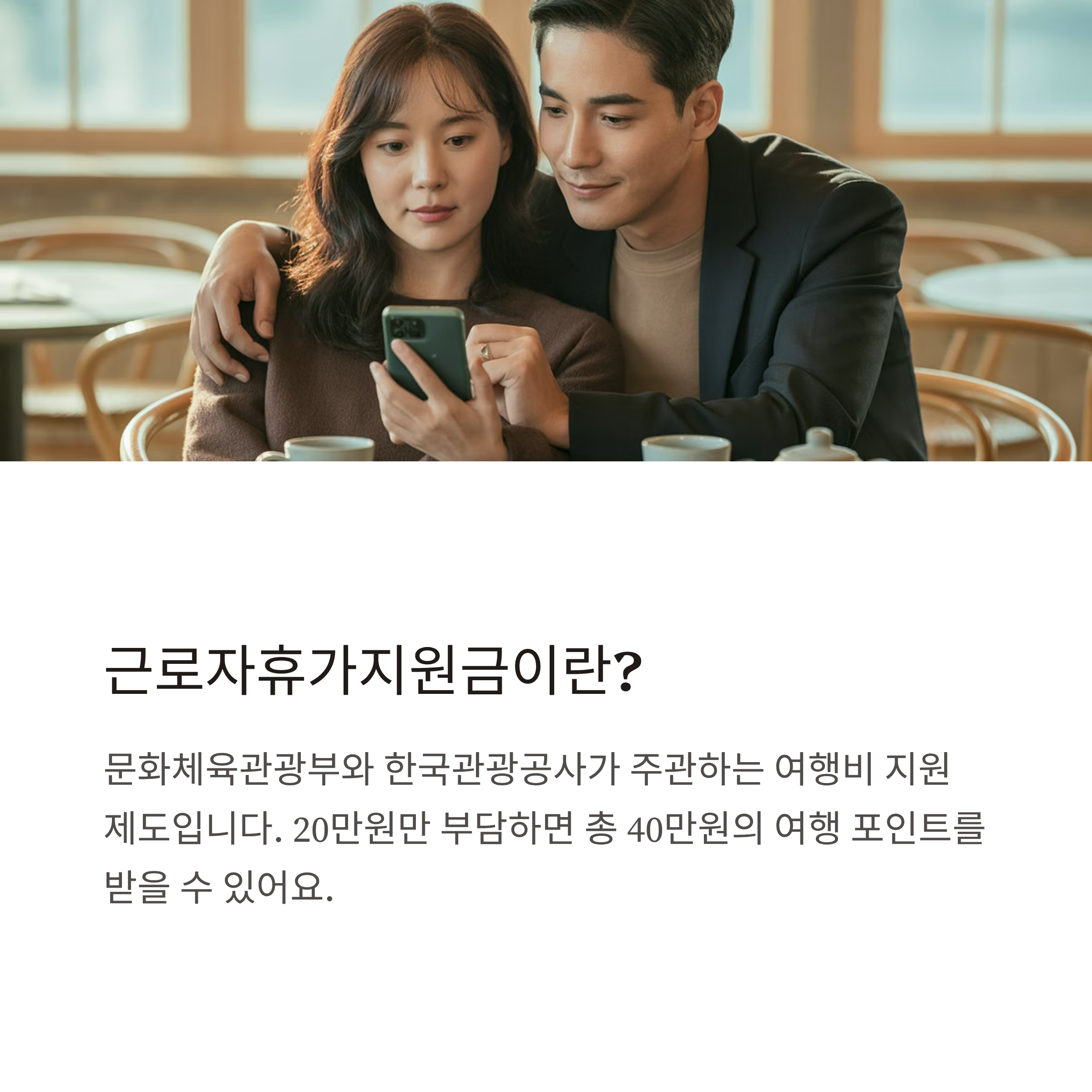 근로자휴가지원금은 문화체육관광부와 한국관광공사가 주관하는 국내 여행비 지원 제도입니다.근로자가 20만원을 부담하면, 기업과 정부가 각각 10만원씩 지원하여 총 40만원 상당의 여행 포인트를 제공합니다.
