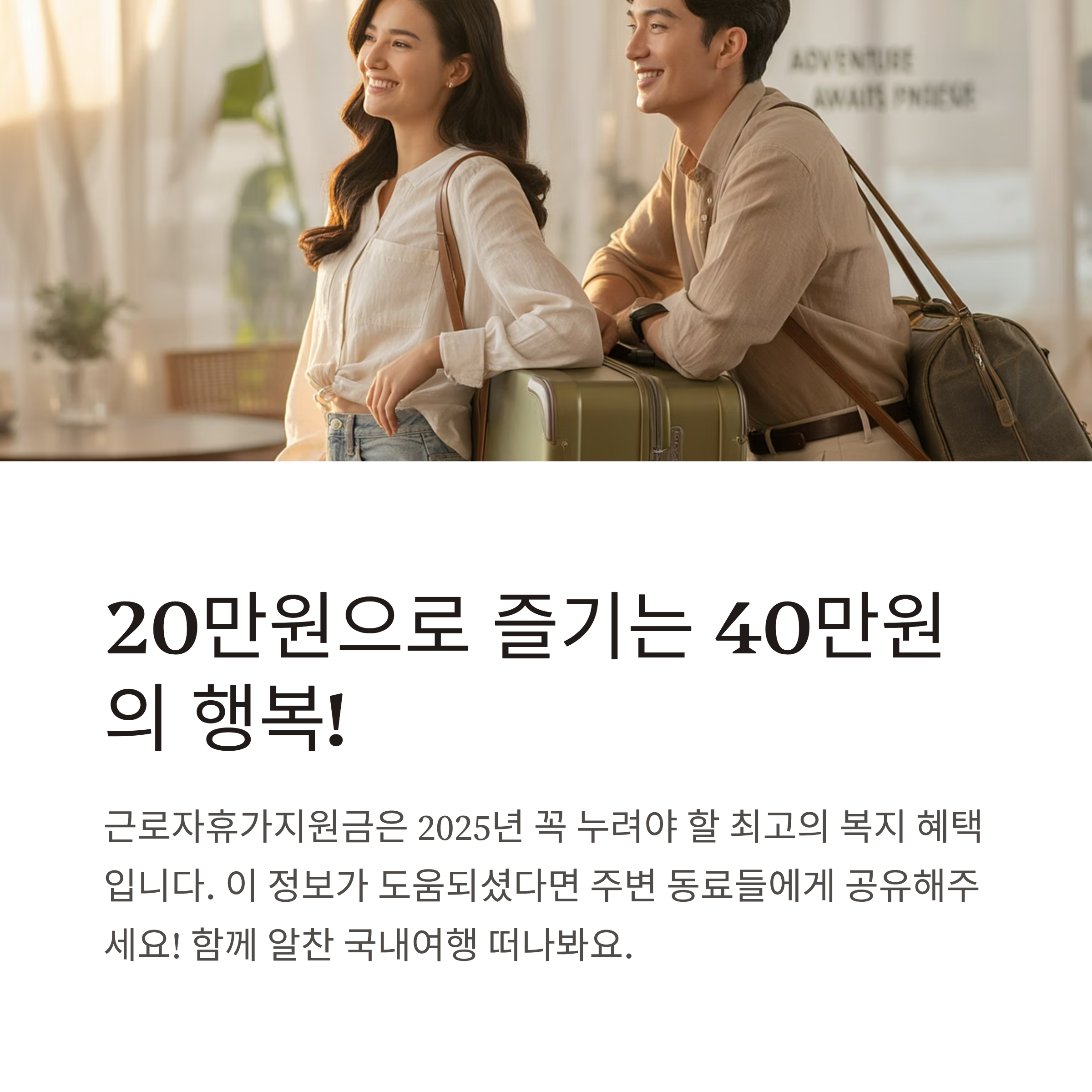 여행 가고 싶은 마음은 굴뚝같지만, 비용 걱정에 매번 포기하셨나요?그렇다면 지금부터 소개할 근로자휴가지원금 제도에주목해보세요.단 20만원만 부담하면 총 40만원 상당의 국내여행 혜택을 누릴 수 있는 제도입니다.