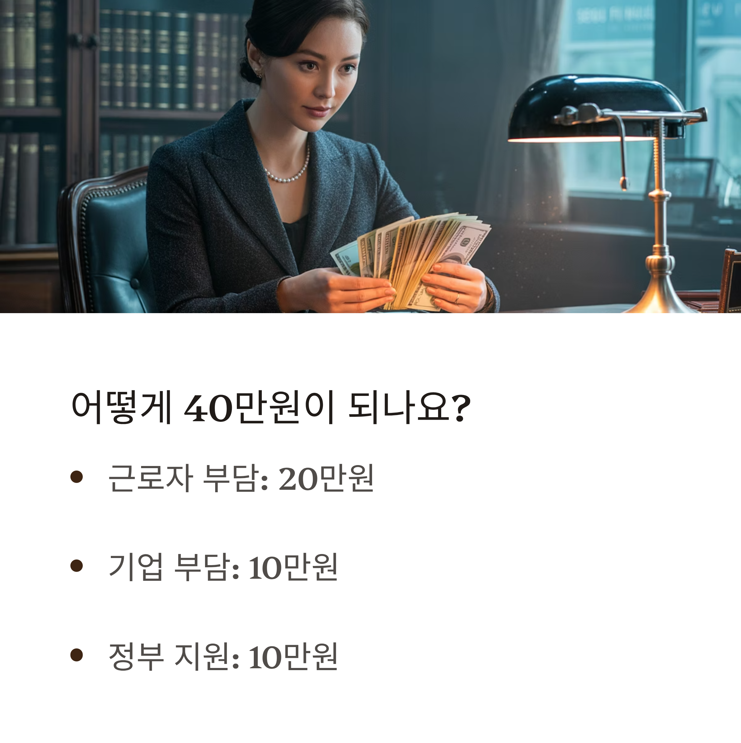 A3. 정부는 근로자 1인당 10만원을 지원하며, 기업도 10만원을 분담합니다. 개인은 20만원만 부담하면 됩니다.