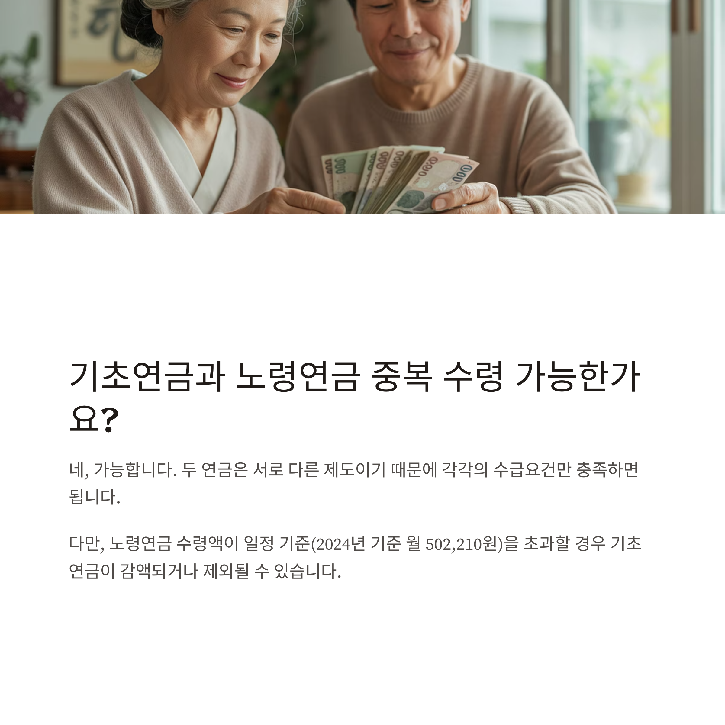 ▶ 2024년 기준 월 502,210원 이상 국민연금(노령연금) 수령 시 기초연금 감액 또는 제외될 수 있음