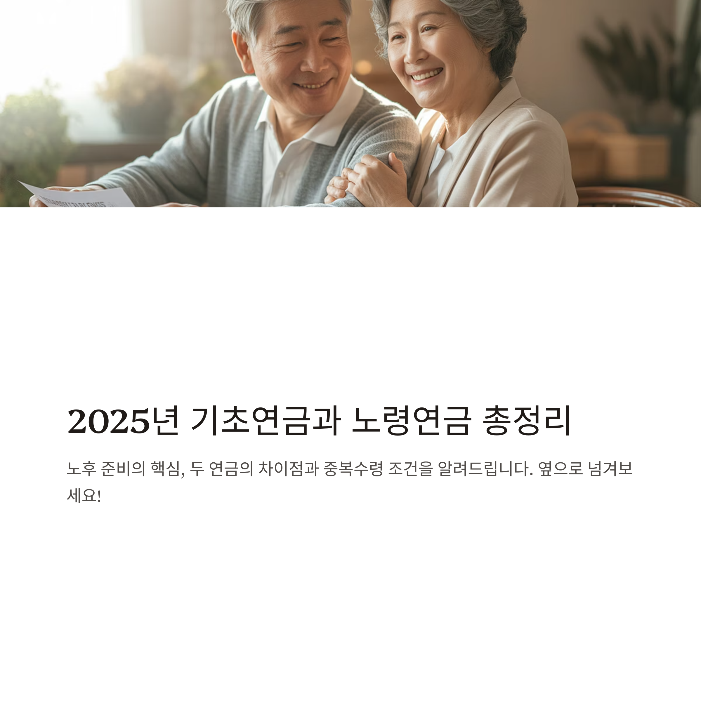기초연금과 노령연금은 단순한 복지 정책을 넘어 노후 안정의 핵심 기둥입니다. 둘 다 받을 수 있지만조건에 따라 감액될 수 있는 점을 꼭 유의해야 하며, 신청은 반드시 직접 진행해야 합니다.지금 바로 본인의 연금 조건을 확인해보고, 노후 준비를 시작해보세요.준비된 노후, 기초연금과 노령연금에서 시작됩니다.
