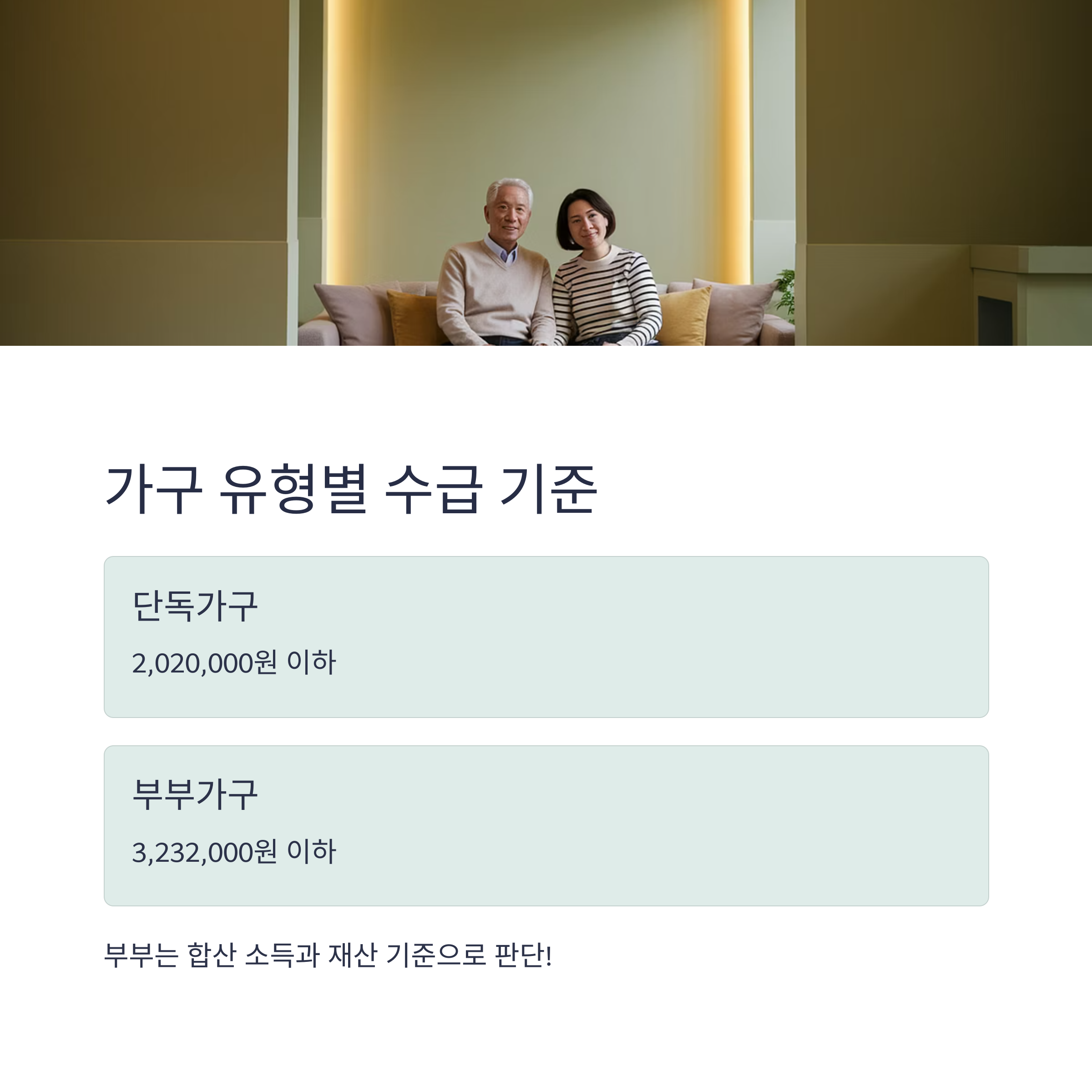 부부가 함께 살 경우 합산 소득과 재산을 기준으로 판단!