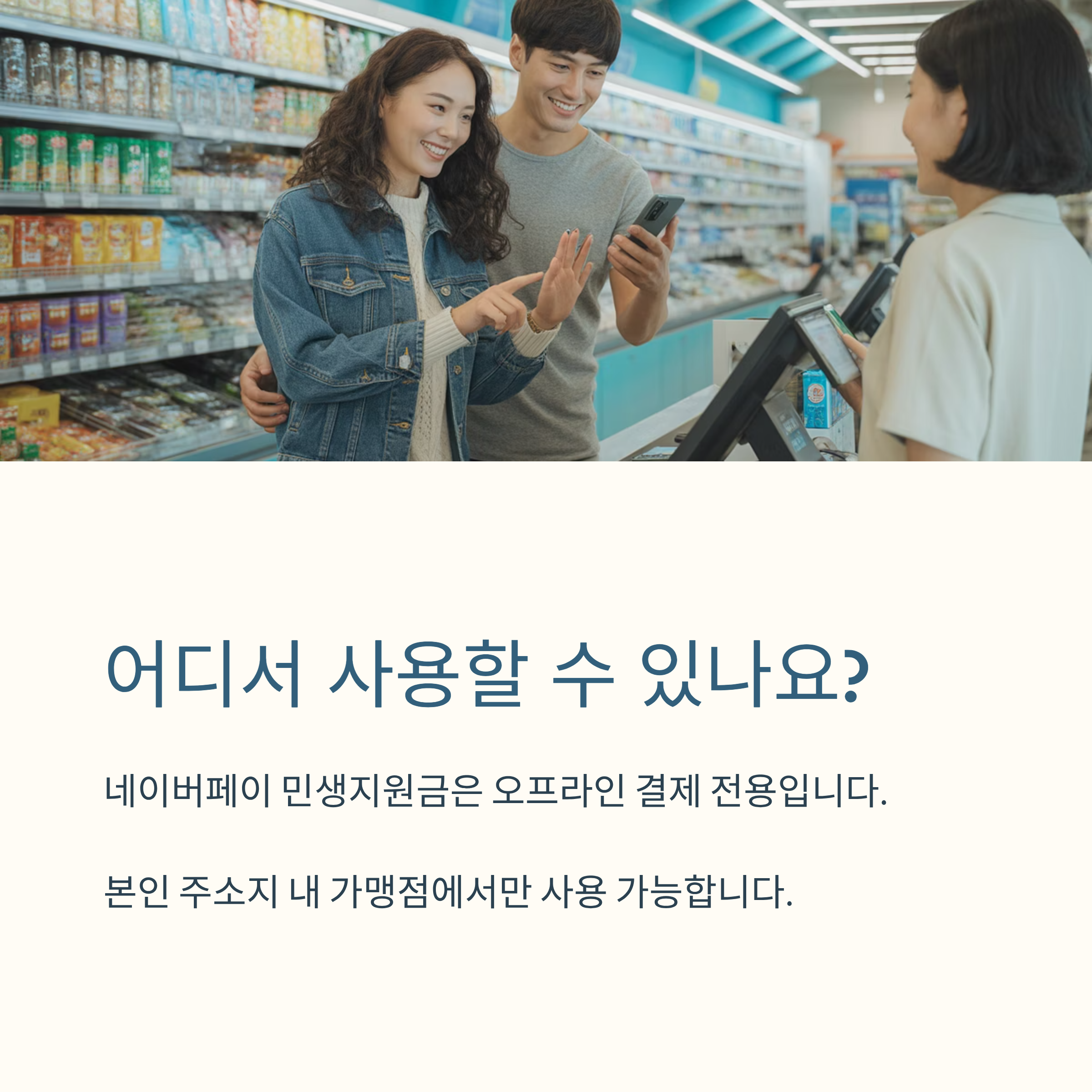 네이버페이 민생지원금은 오프라인 결제 전용이며, 본인 주소지 내 가맹점에서만 사용 가능합니다.