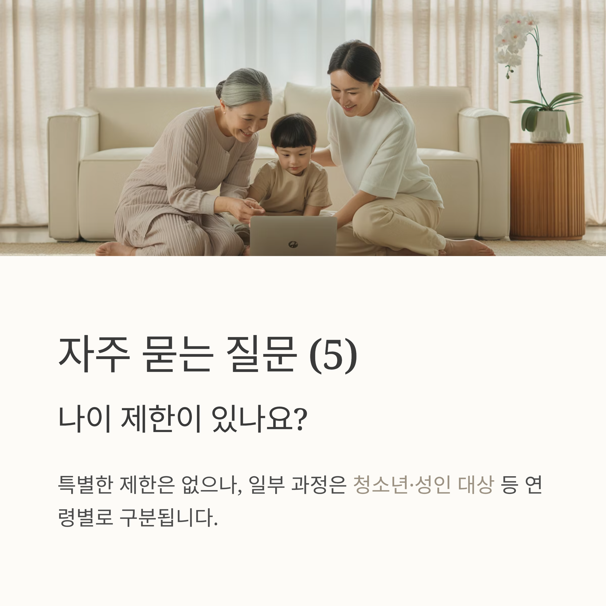 A5. 특별한 제한은 없으나, 일부 과정은 청소년·성인 대상 등 연령별로 구분됩니다.