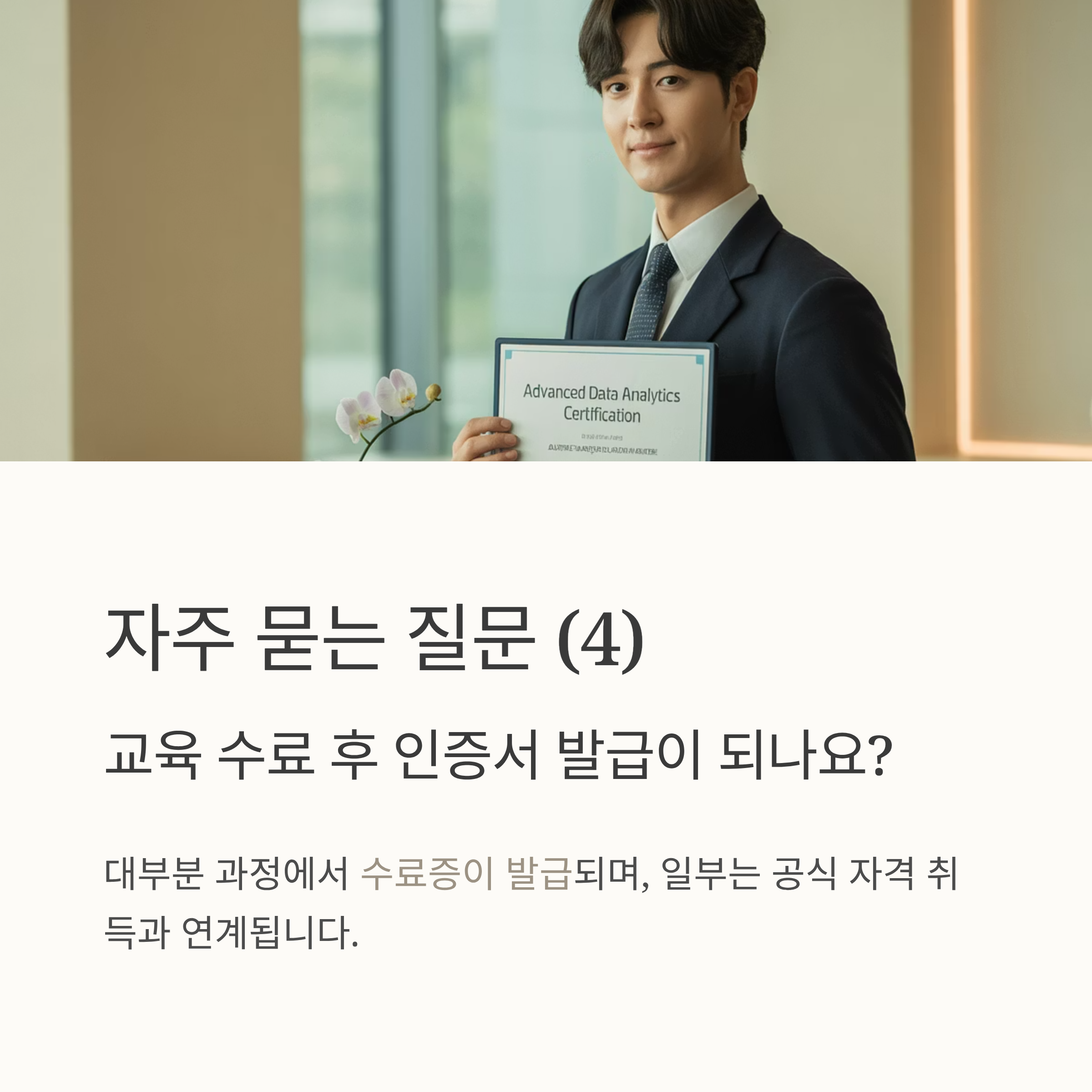 A4. 대부분 과정에서 수료증이 발급되며, 일부는 공식 자격 취득과 연계됩니다.