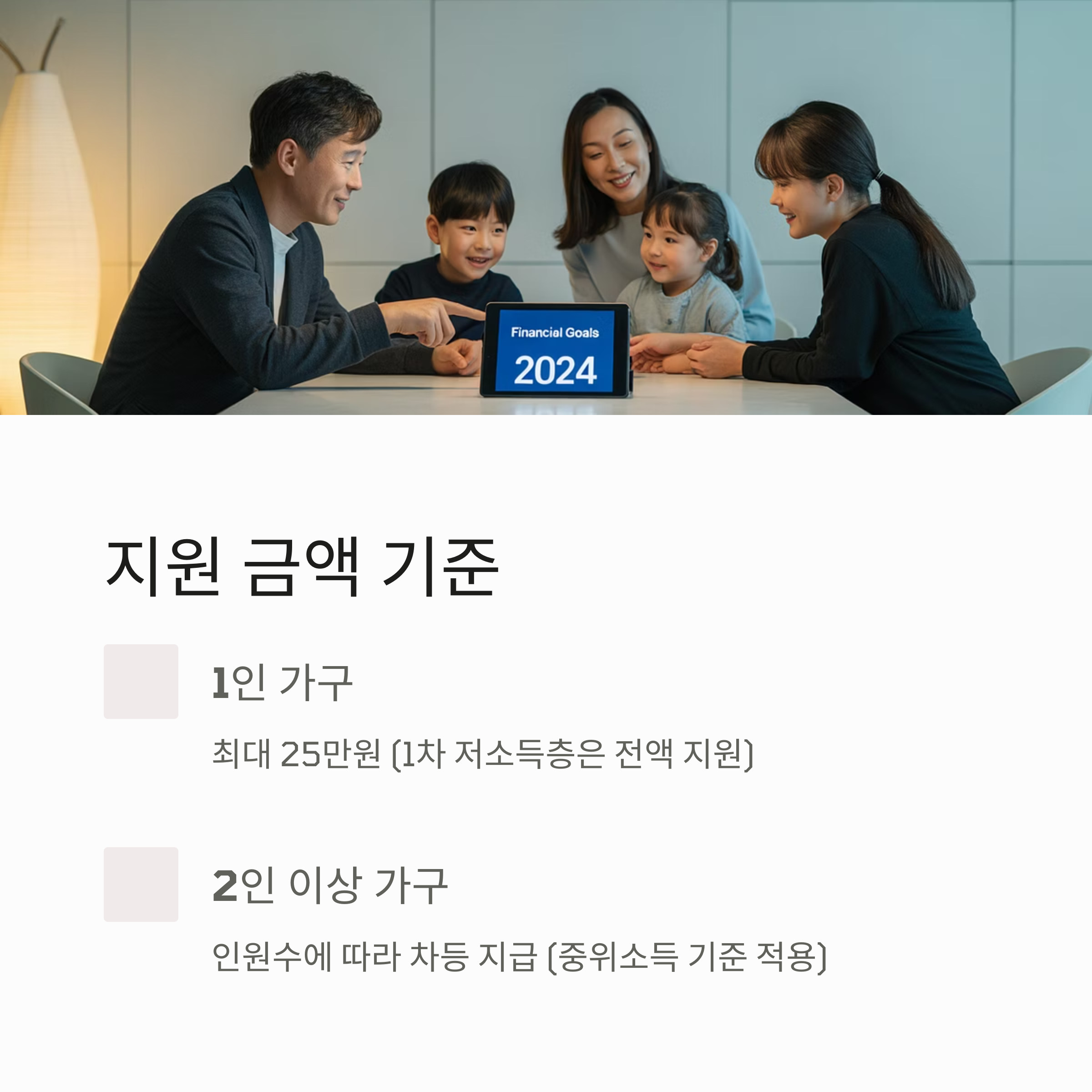| 1인 가구 | 25만원 | 1차 저소득층은 전액 지원 |