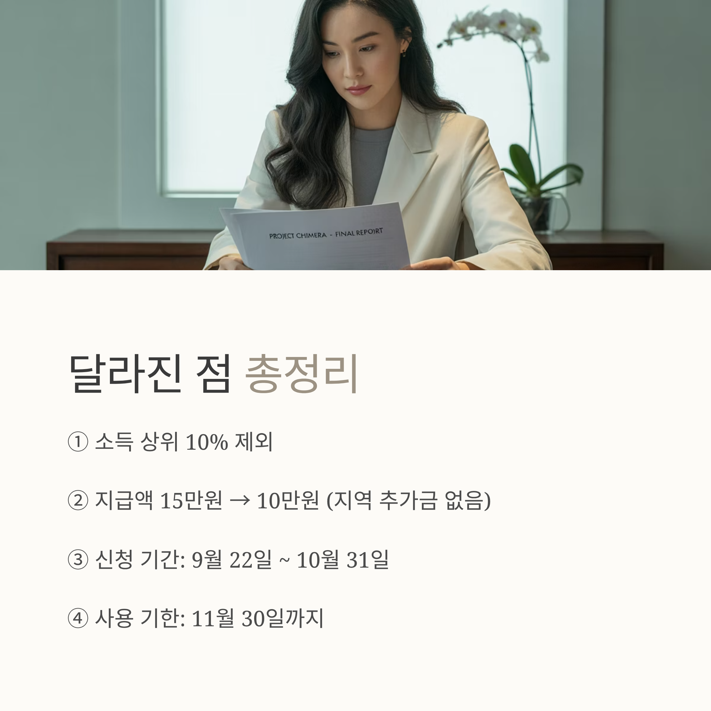 2025년 민생회복지원금 2차는 1차와 달리 소득 상위 10%가 제외되고, 지역 추가 금액이 없는 것이 특징입니다. 신청일은 9월 22일부터 10월 31일까지이며, 빠르게 신청하면 추석 전에 받을 수 있습니다. 신생아 지급 여부 등 세부 사항은 신청 직전에 최종 확인하시기 바랍니다.
