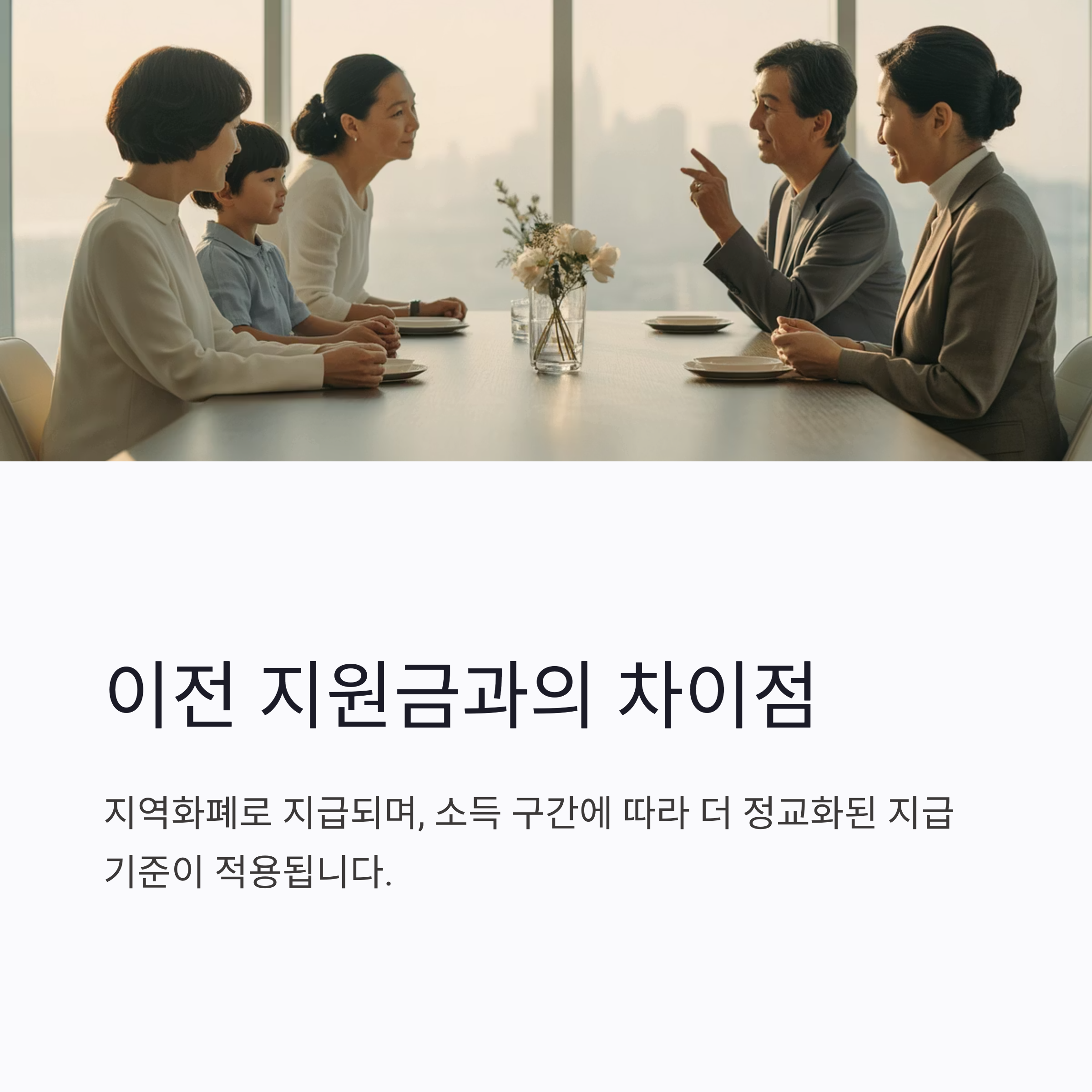 A8. 지역화폐로 지급되며, 지급 금액과 기준도 소득 구간에 따라 더 정교화되었다는 점이 다릅니다.