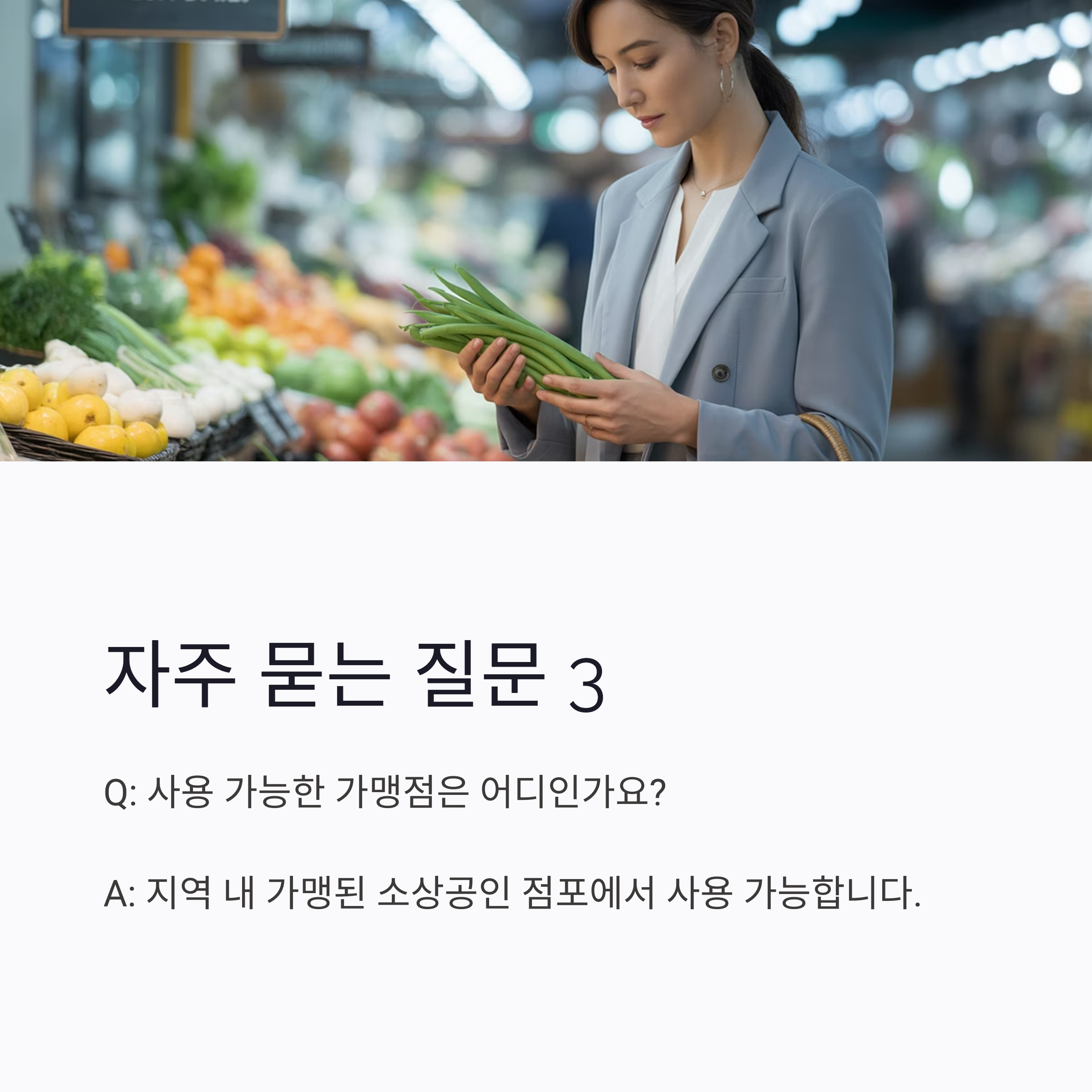 A4. 지역 내 가맹된 소상공인 점포에서만 사용 가능합니다. 지자체별 가맹점은 추후 공지됩니다.