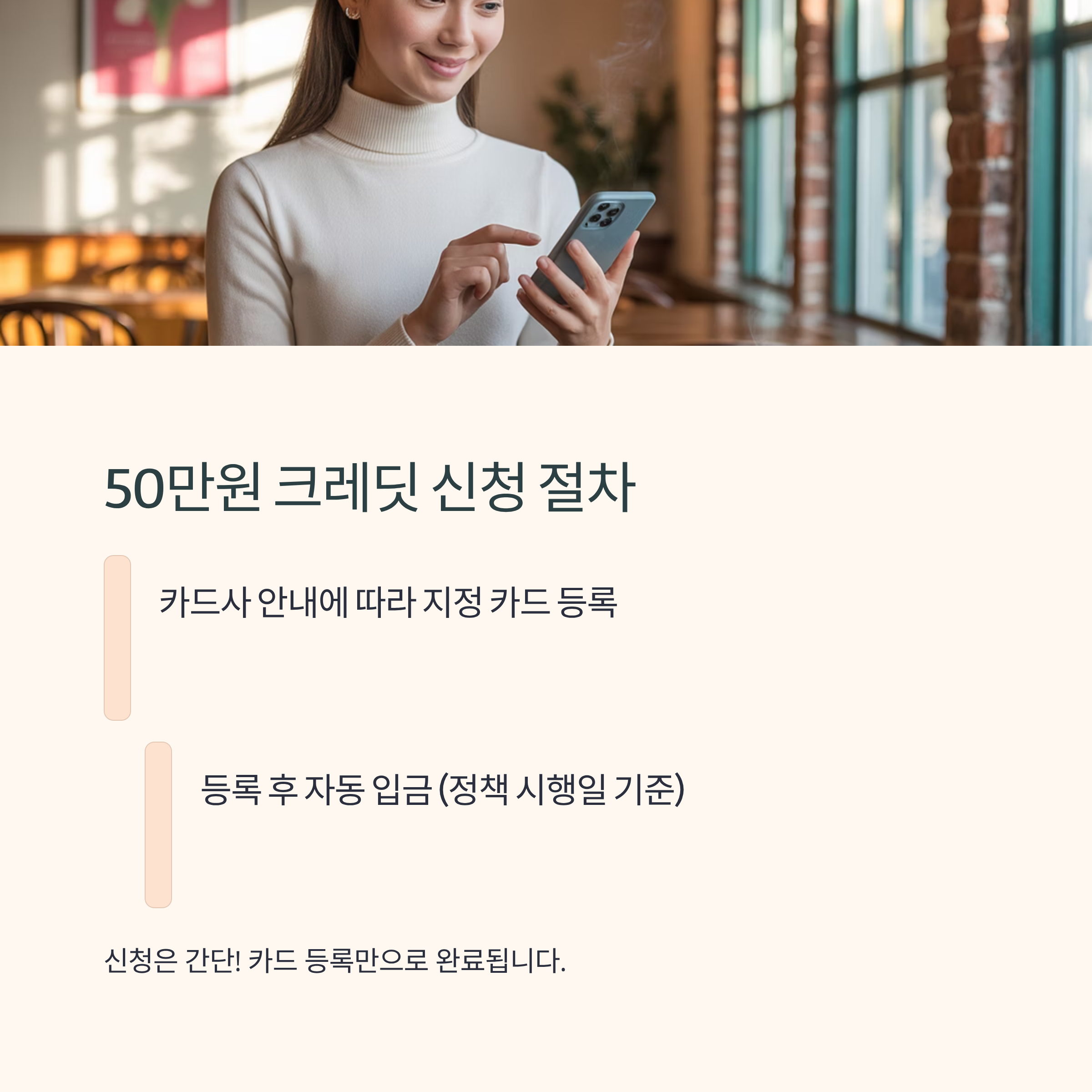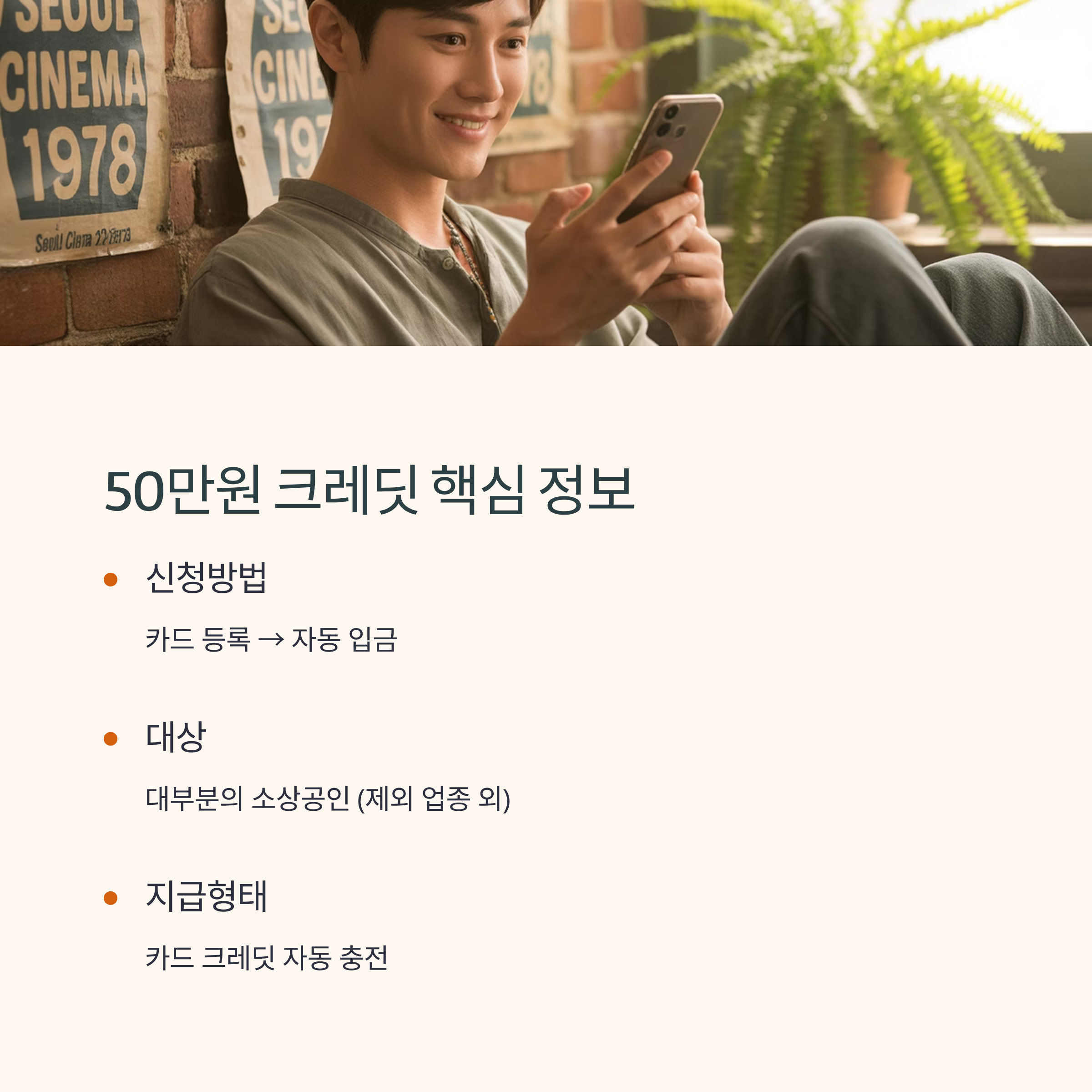 가장 인기 있는 혜택인 50만 원 크레딧은 카드 등록만 하면 받을 수 있는 즉시 지원형 정책자금입니다. 최근 발표된