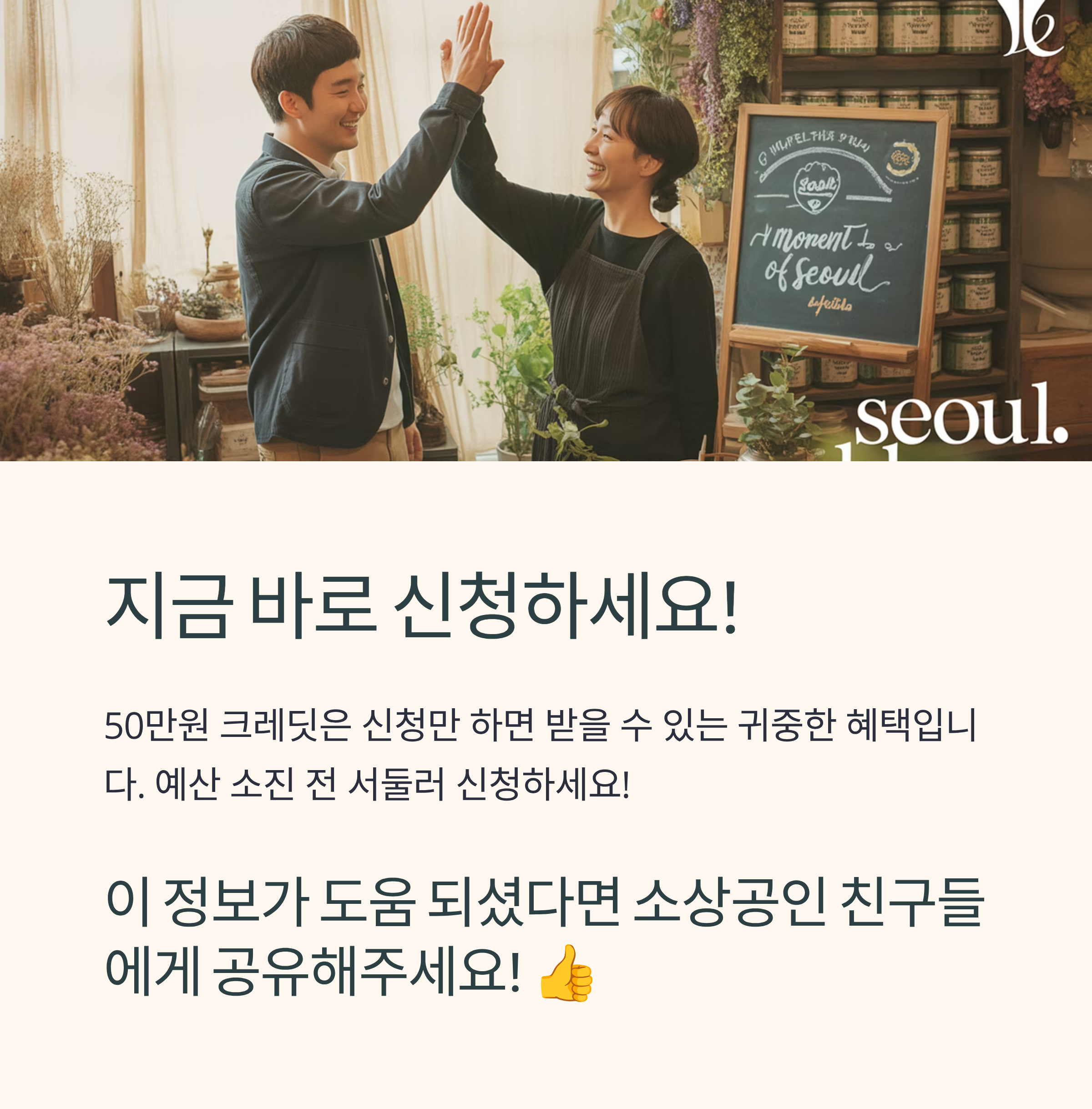 정부의 소상공인 정책자금은 신청만 하면 받을 수 있는 귀중한 혜택입니다. 특히 50만 원 크레딧은 간편하게 카드 등록만으로도 즉시 지원받을 수 있으니, 지금 바로 신청해보세요! 자금이 필요한 소상공인이라면 SEMAS의 정책자금 대출도 함께 확인해 보시길 추천합니다.