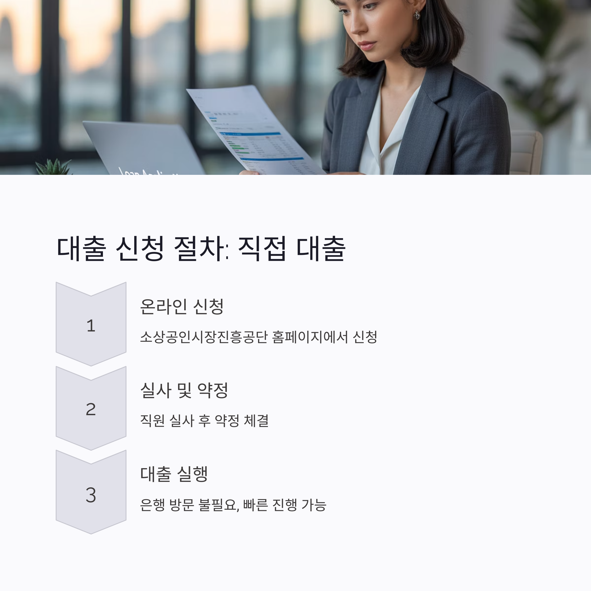 ▶ 소상공인시장진흥공단 홈페이지에서 온라인 신청 ▶ 직원 실사 및 약정 체결 후 대출 실행 ▶ 은행 방문 불필요, 빠른 진행 가능