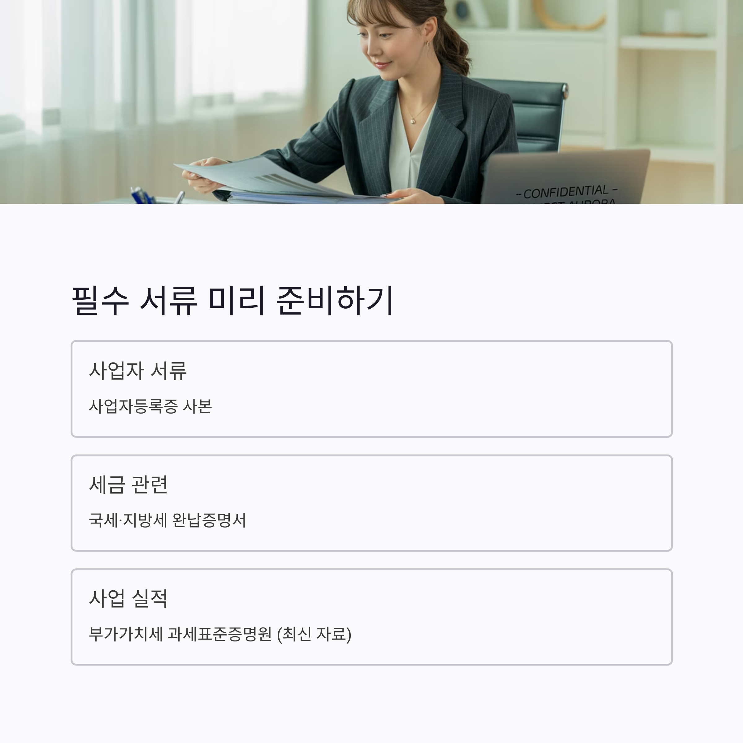 ✅ 사업자등록증 사본 ✅ 국세·지방세 완납증명서 ✅ 부가가치세 과세표준증명원 (매년 7월 1일 기준 최신 자료 필요)