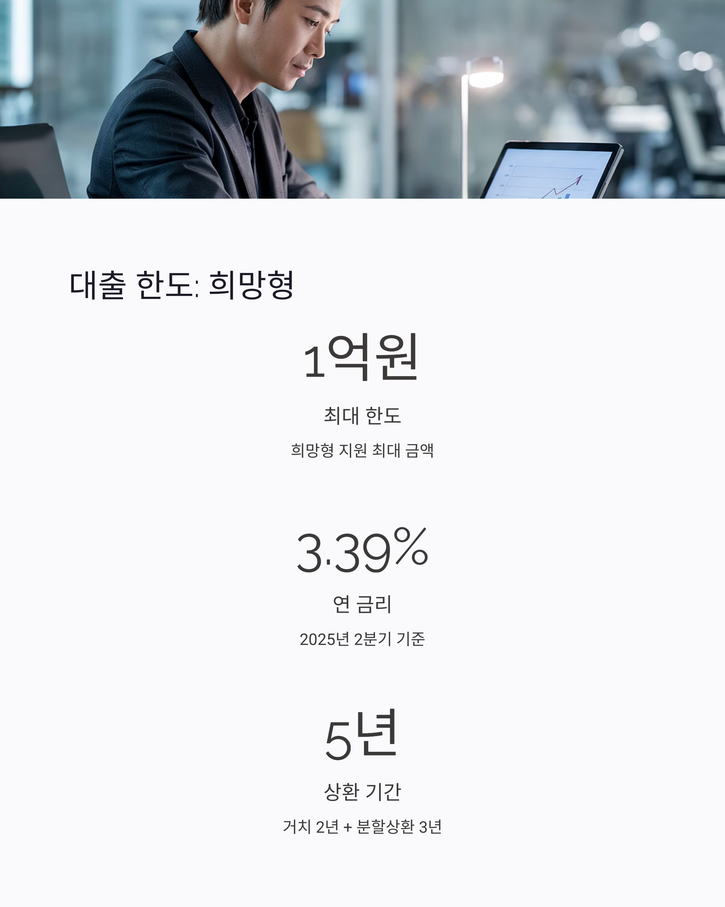 금리는 일반 신용대출보다 훨씬 저렴하며, 거치기간이 있어 초기 상환 부담도 적습니다.