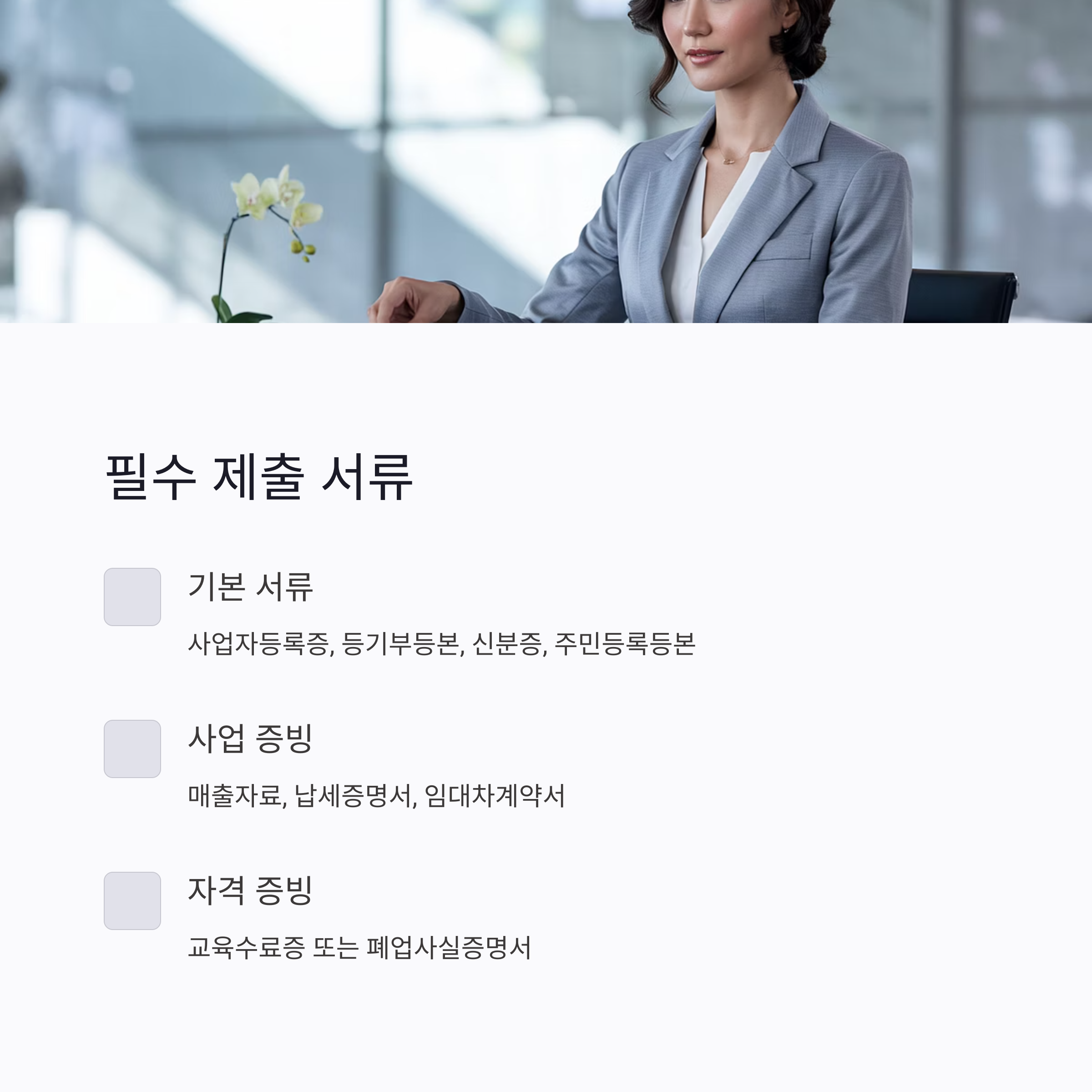 이 외에도 이전 폐업 기록과 매출 실적 등도 증빙 가능해야 하며, 업종·매출이 변경된 경우 관련 자료가 필수입니다.