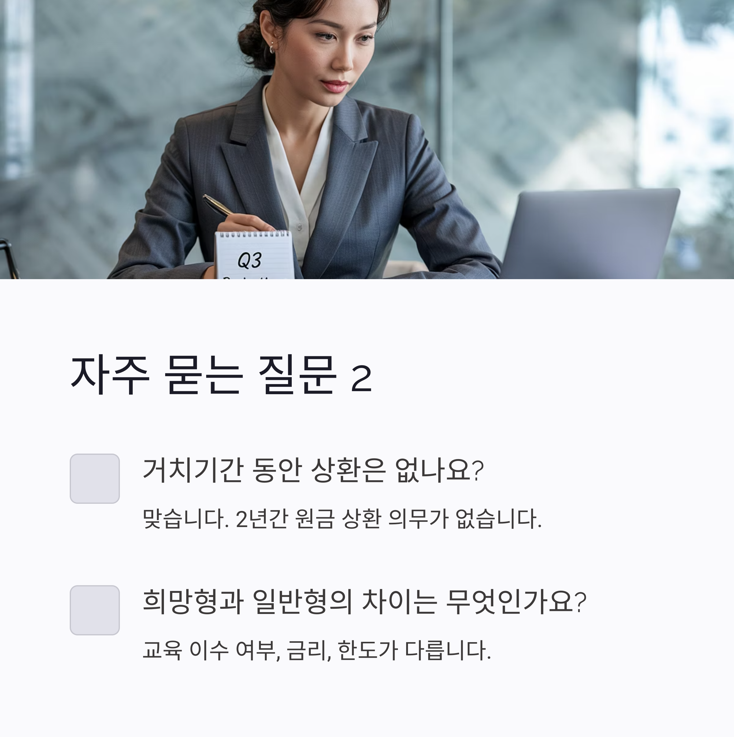 A3. 맞습니다. 거치기간 2년 동안 원금 상환 의무는 없으며, 이후 3년간 분할 상환합니다.