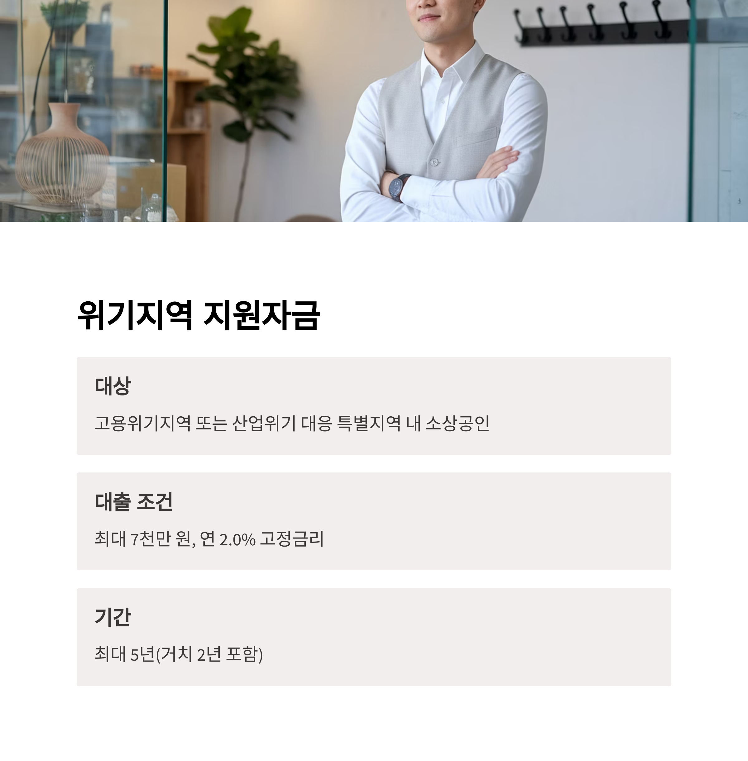 고용위기지역 또는 산업위기 대응 특별지역 내 소상공인이 대상입니다.