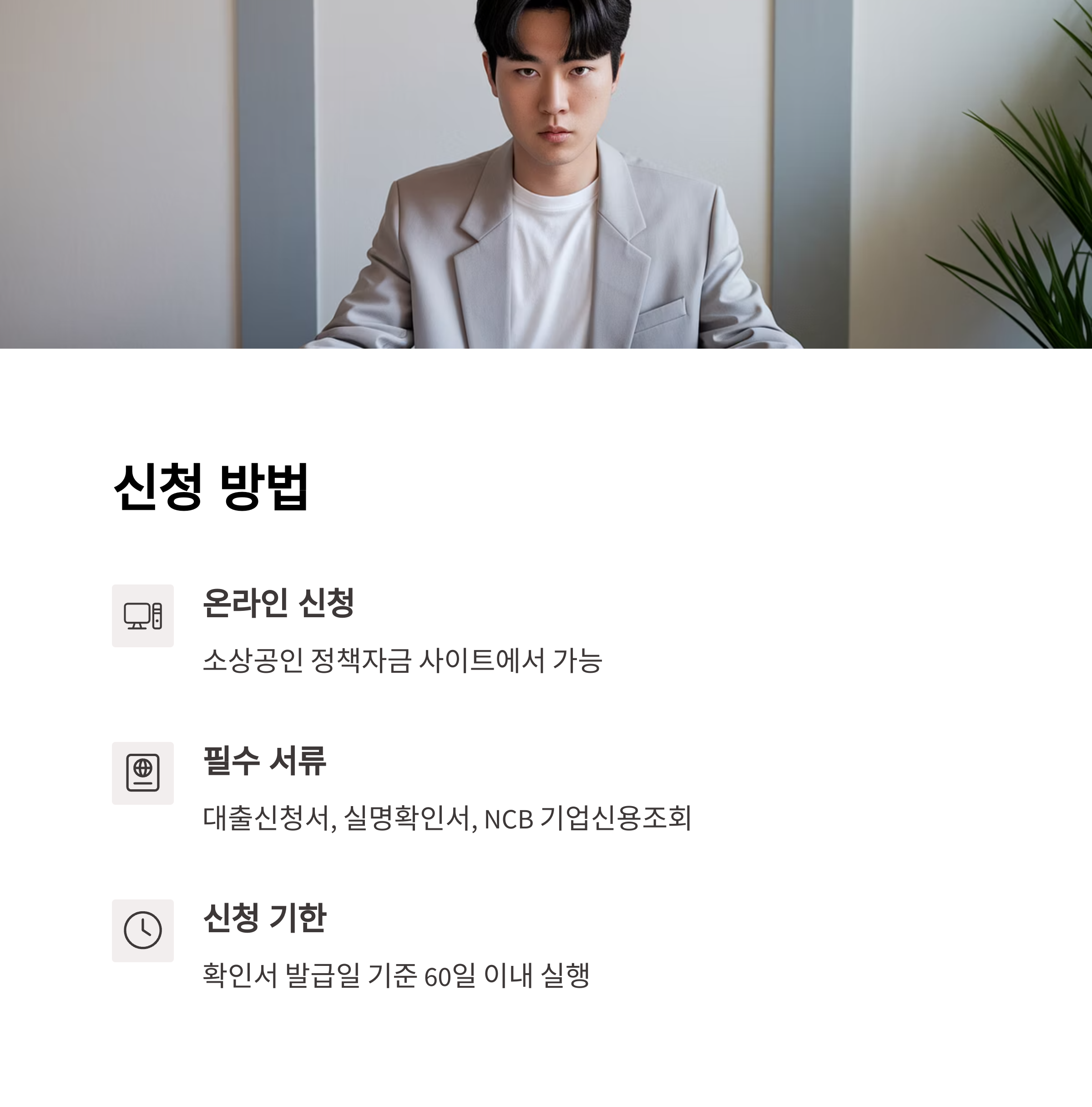▶ 필수 서류: 대출신청서, 실명확인서, NCB 기업신용조회