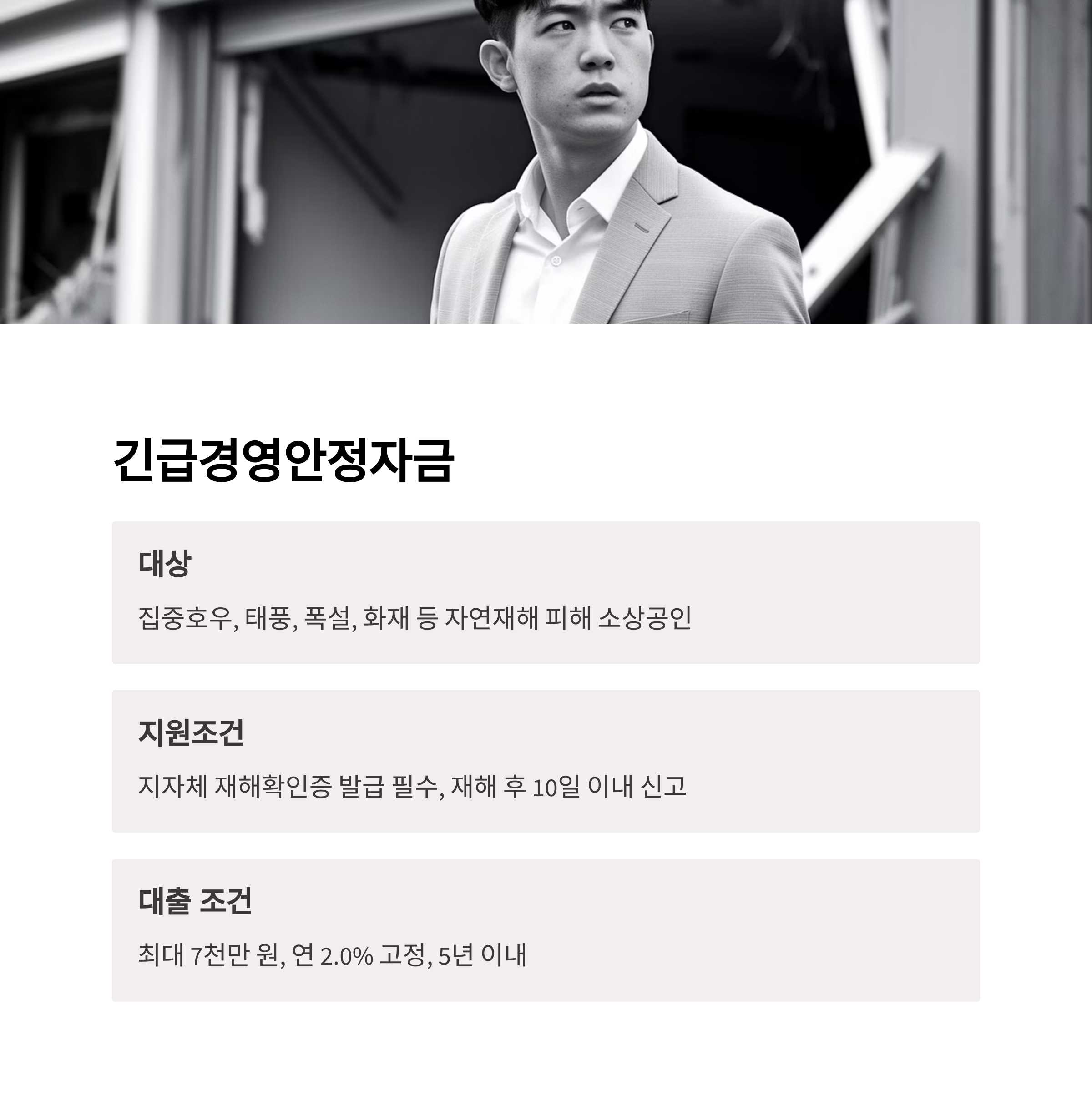 집중호우, 태풍, 폭설, 화재 등 자연재해로 피해를 입은 소상공인 대상