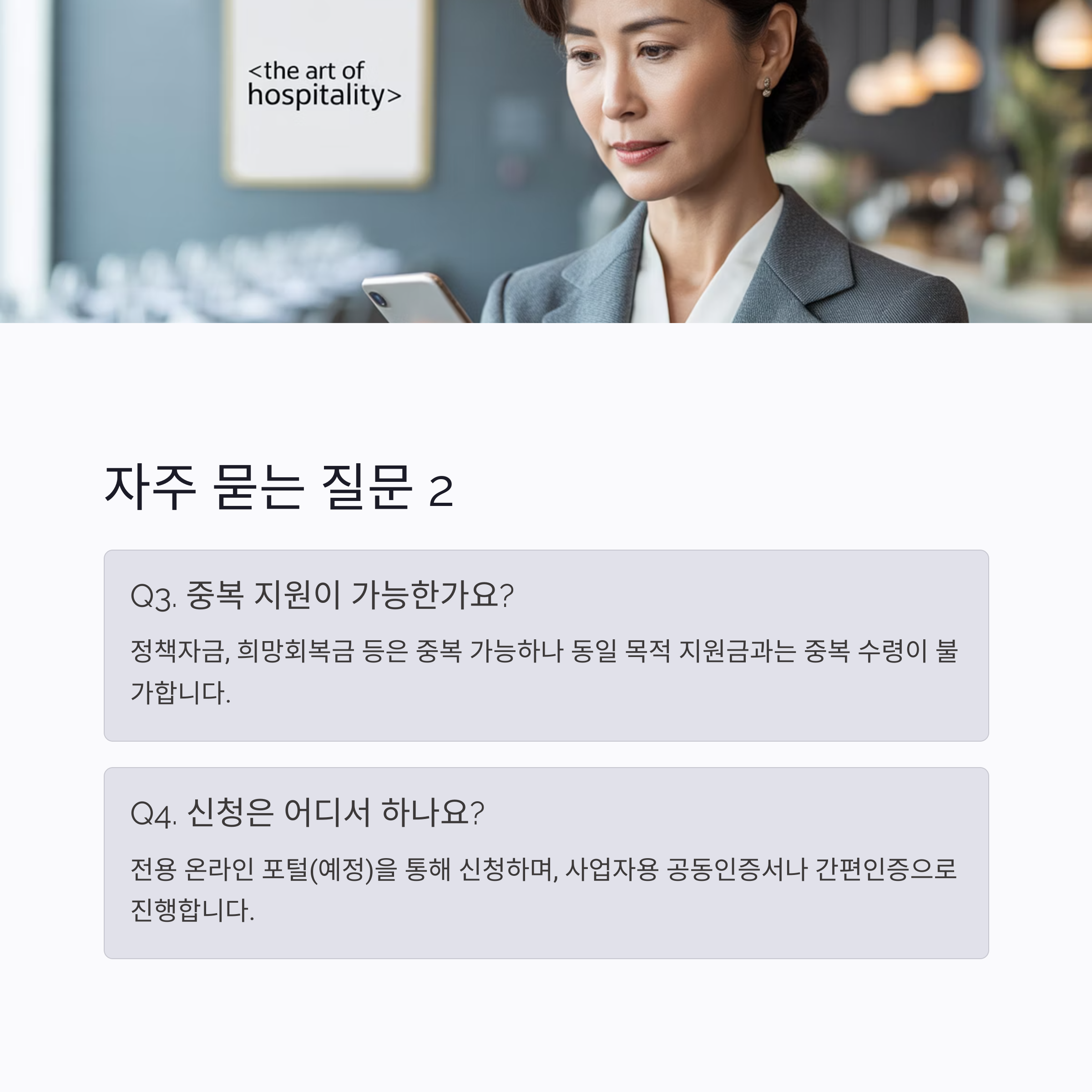 A5. 정책자금, 희망회복금 등 일부는 중복 가능하나 동일 목적 지원금과는 중복 수령이 불가합니다.