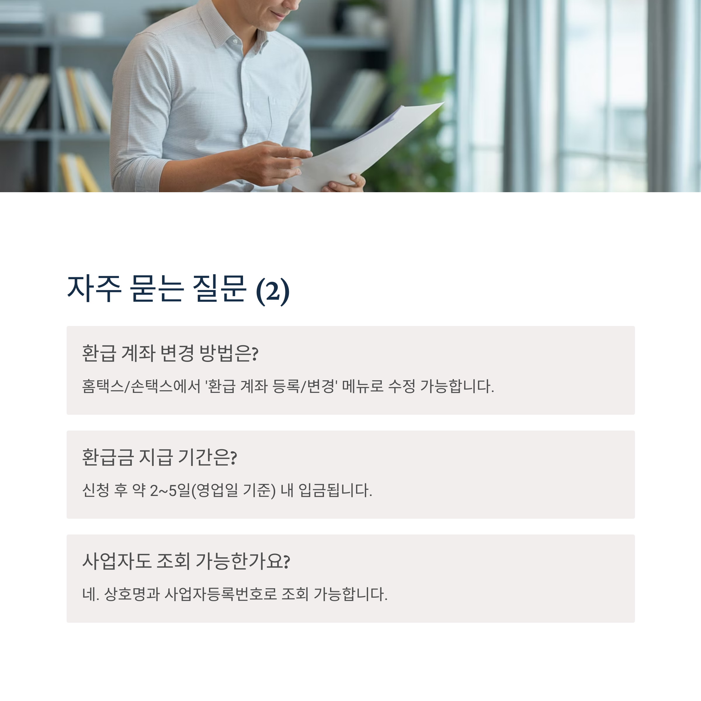 A7. 네. 사업자는 상호명과 사업자등록번호를 입력하면 환급금을 조회할 수 있습니다.