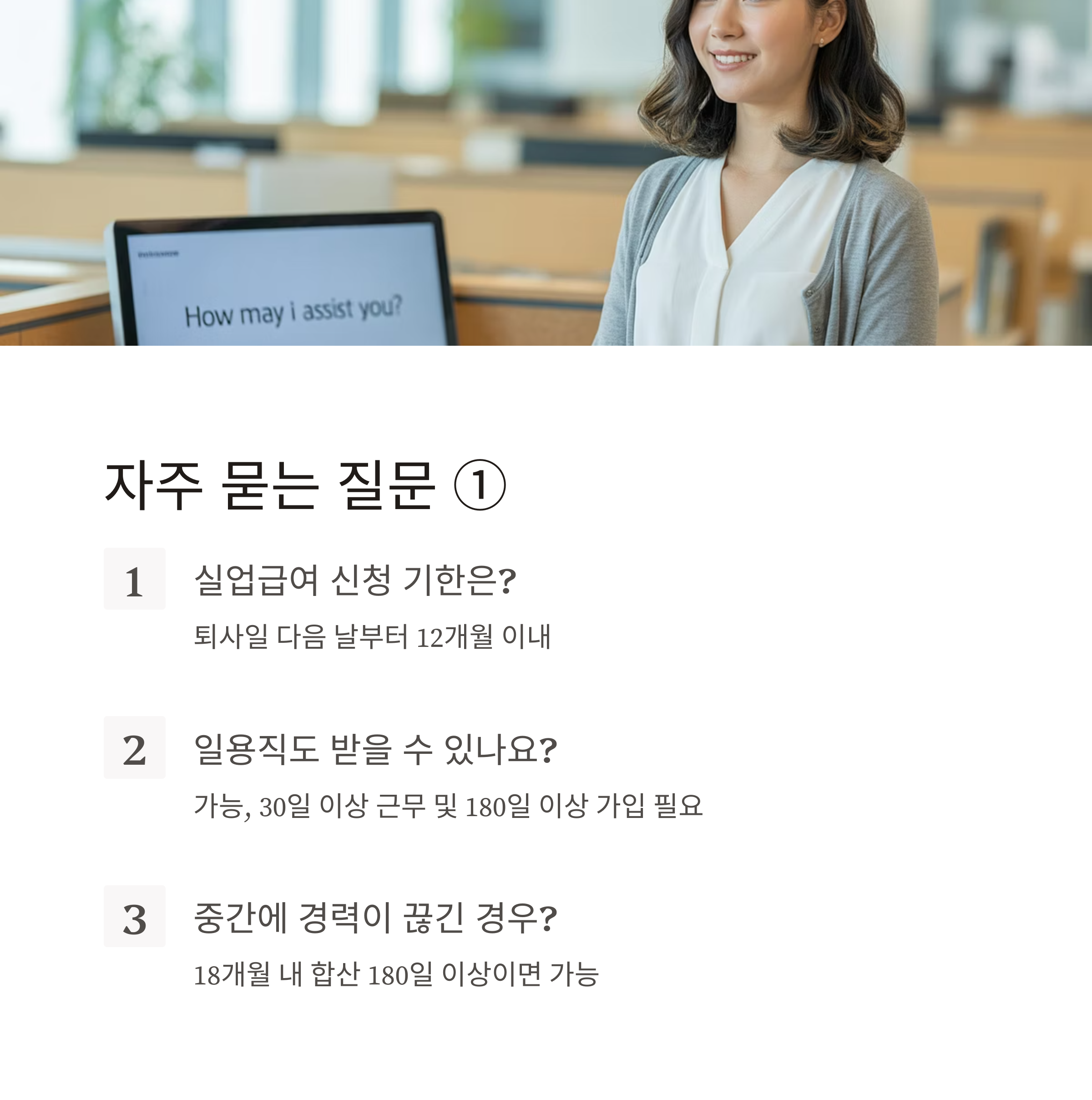 A2. 가능합니다. 다만 30일 이상 근무 및 고용보험 가입된 날이 180일 이상이어야 합니다.