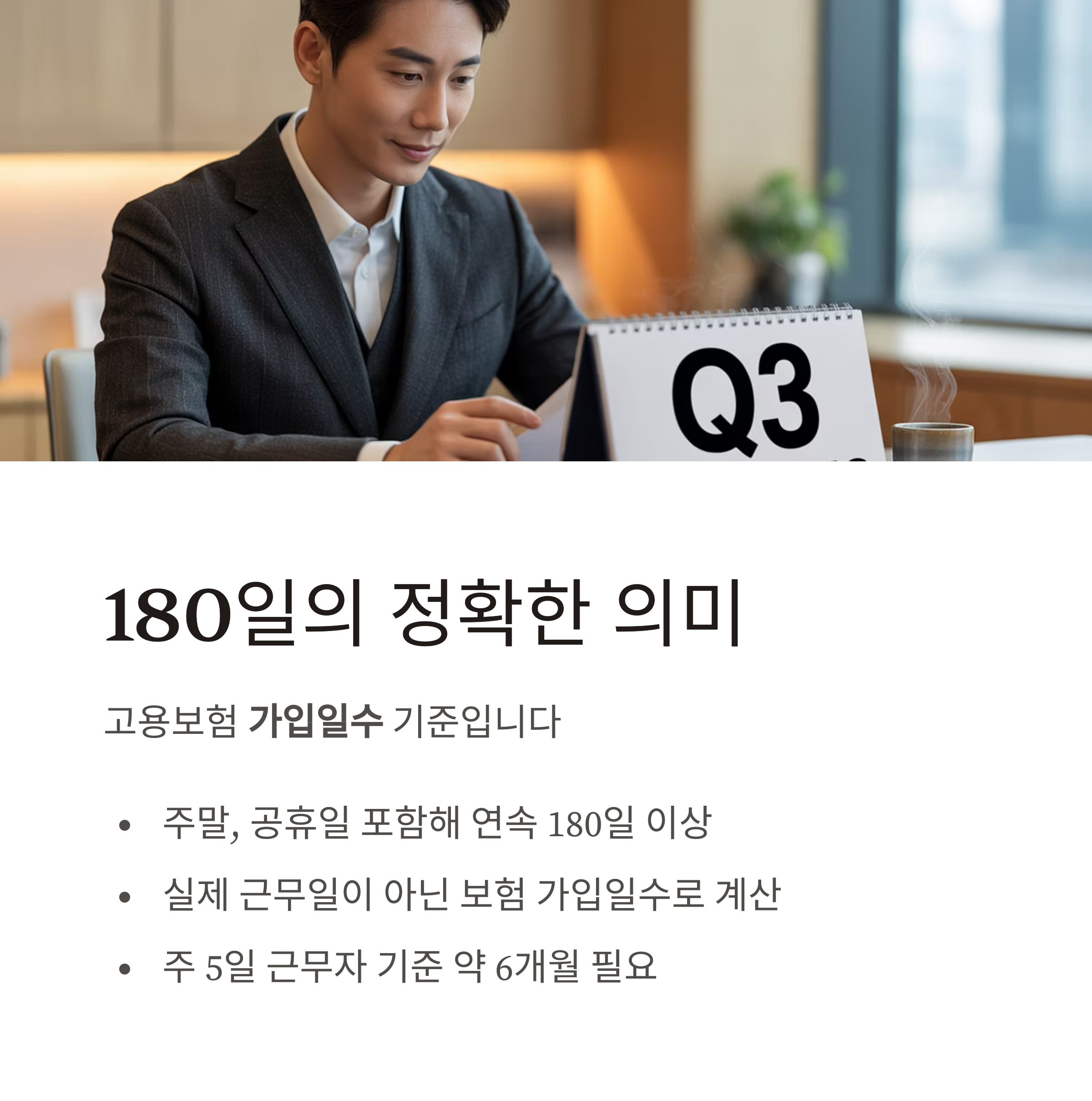 ▶ 고용보험 적용일수를 산정합니다. ▶ 주말, 공휴일 포함 연속된 180일 이상이 되어야 함. ▶ 한 달에 30일로 계산되지 않음, 실제 근무일 기준이 아닌 "보험 가입일수"로 판단. ▶ 일반적으로 주 5일 근무자라면 대략 6개월 이상 근무해야 충족 가능.