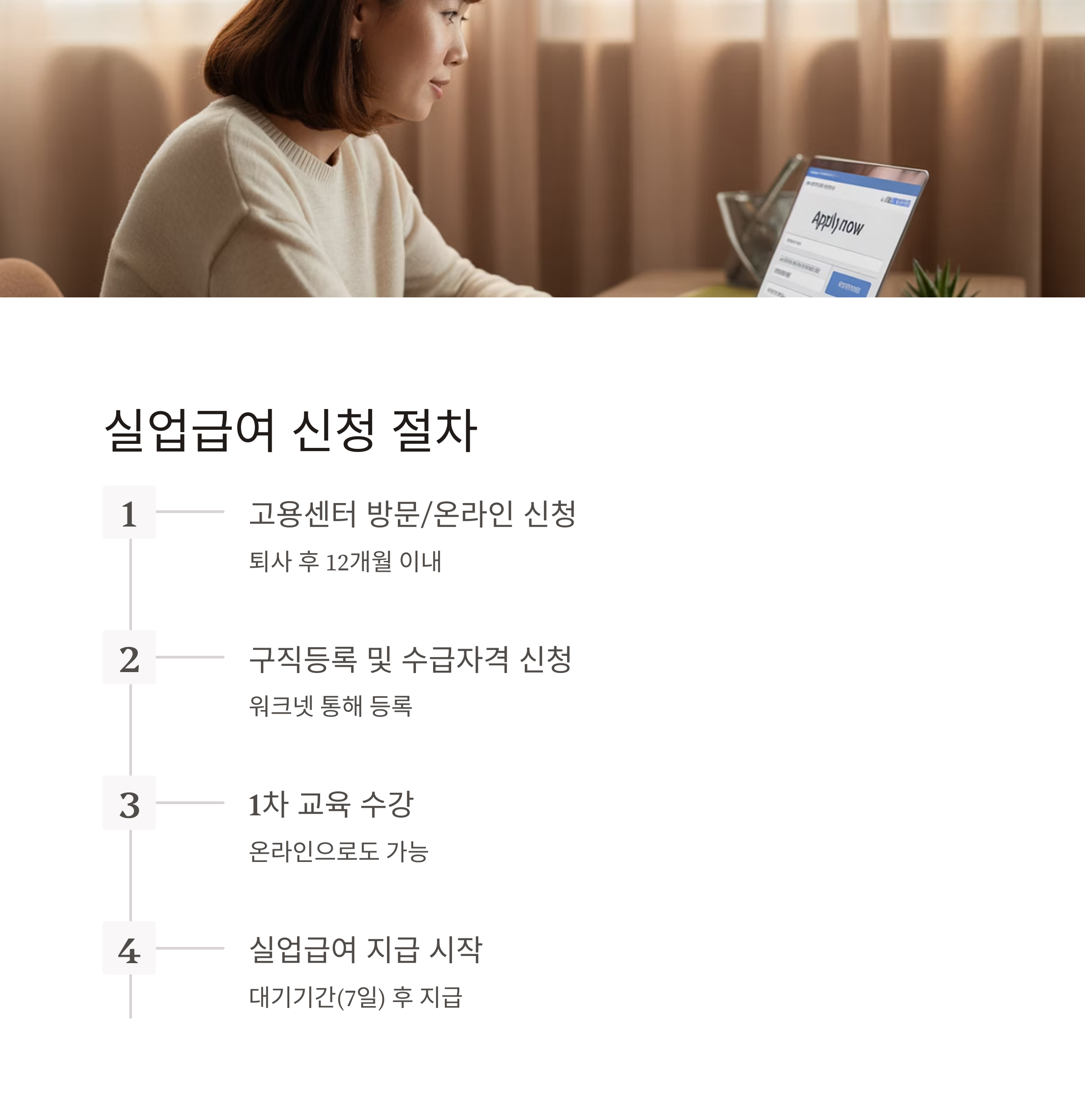 1️⃣ 퇴사 후 12개월 이내 고용노동부 고용센터에 방문 또는 온라인 신청 2️⃣ 워크넷에 구직 등록 및 수급자격 인정 신청서 제출 3️⃣ 1차 교육 수강(온라인 가능) 4️⃣ 수급 인정일 이후 실업급여 지급 개시 5️⃣ 구직활동 증빙 및 4주마다 실업 인증