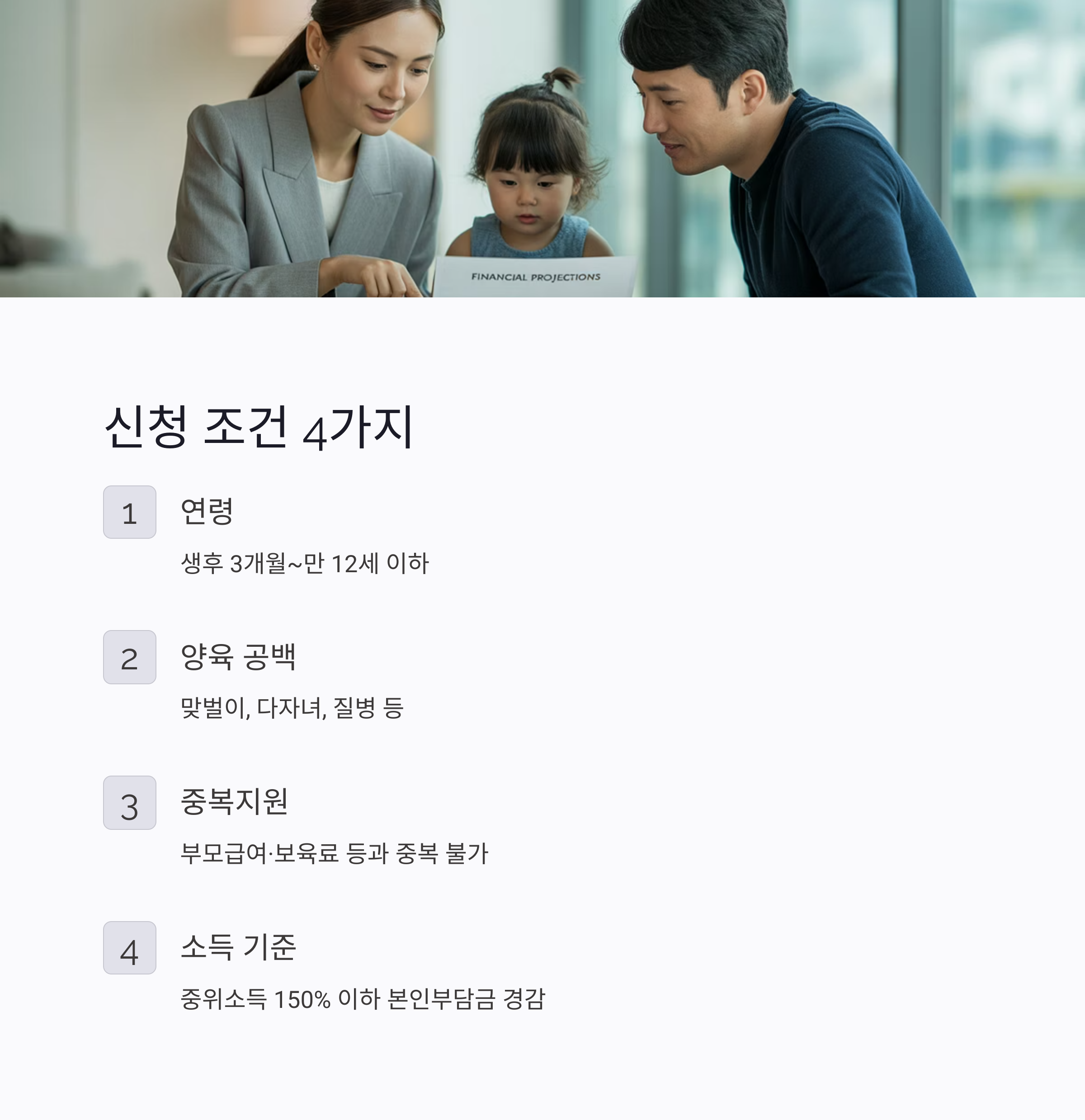 ✔ 중복지원 불가: 부모급여·보육료 등 타 복지 지원과 중복 불가