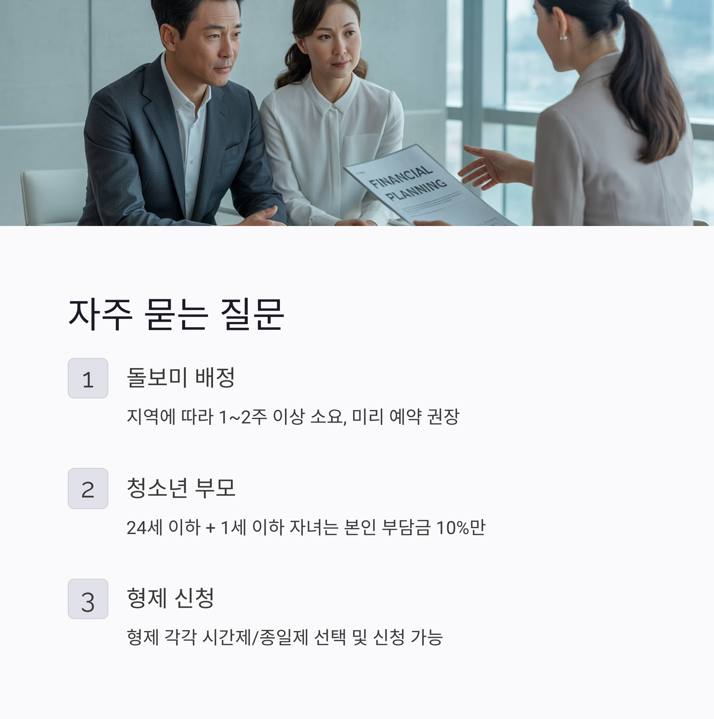 | 시간제 | 최소 2시간 이상 | 만 12세 이하 | 단기/긴급 돌봄에 적합 |